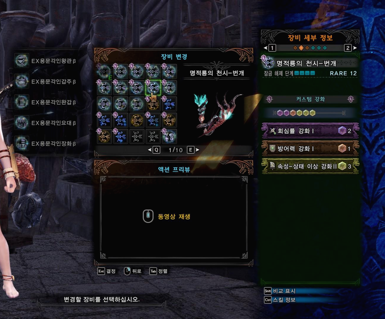 커스텀 강화는 회심1, 속성강화1, 방어력 강화1