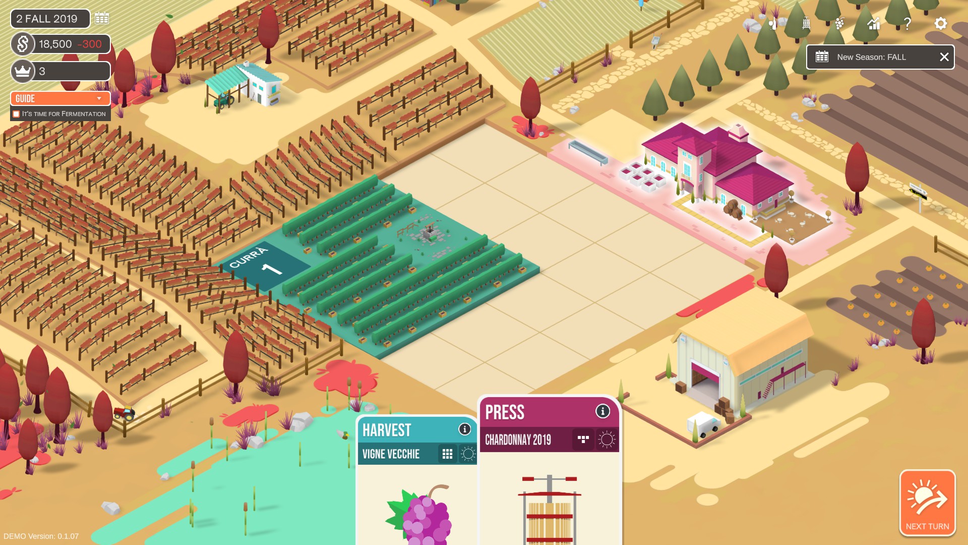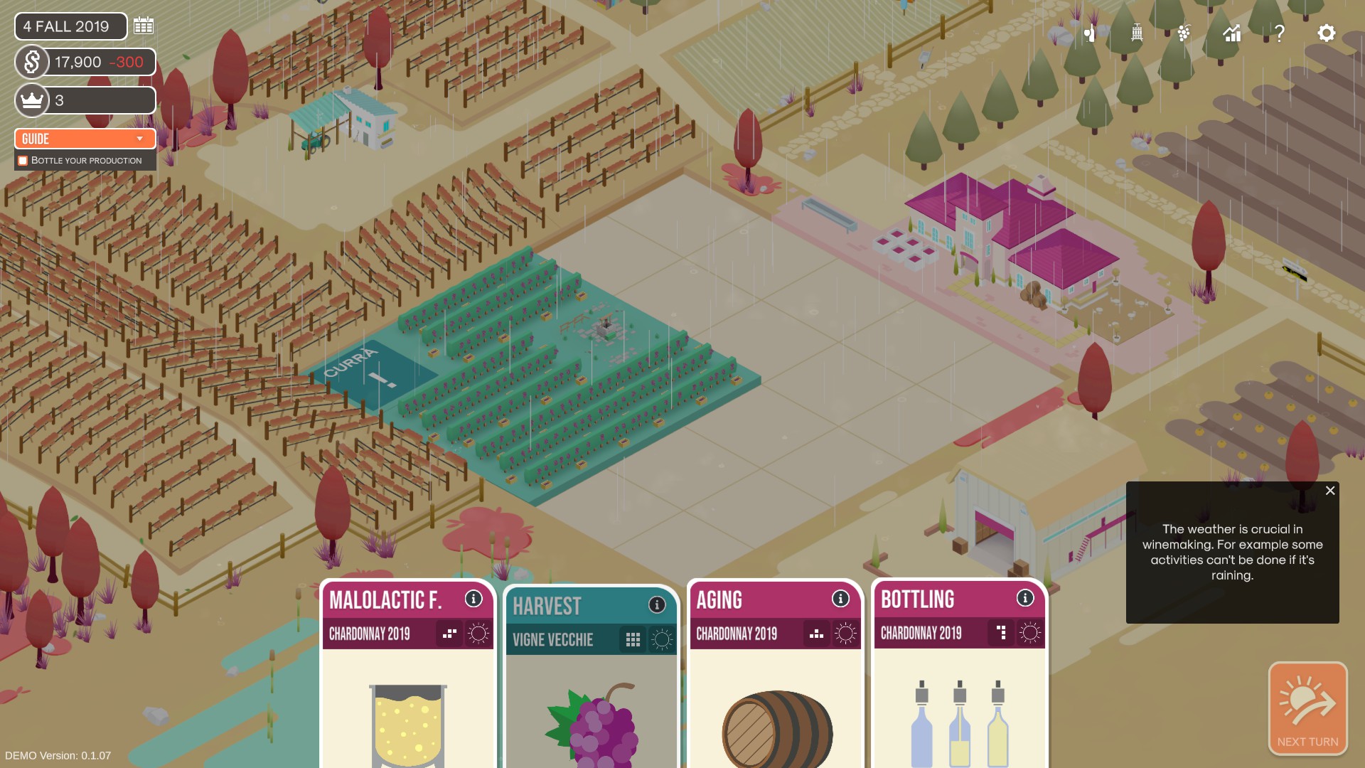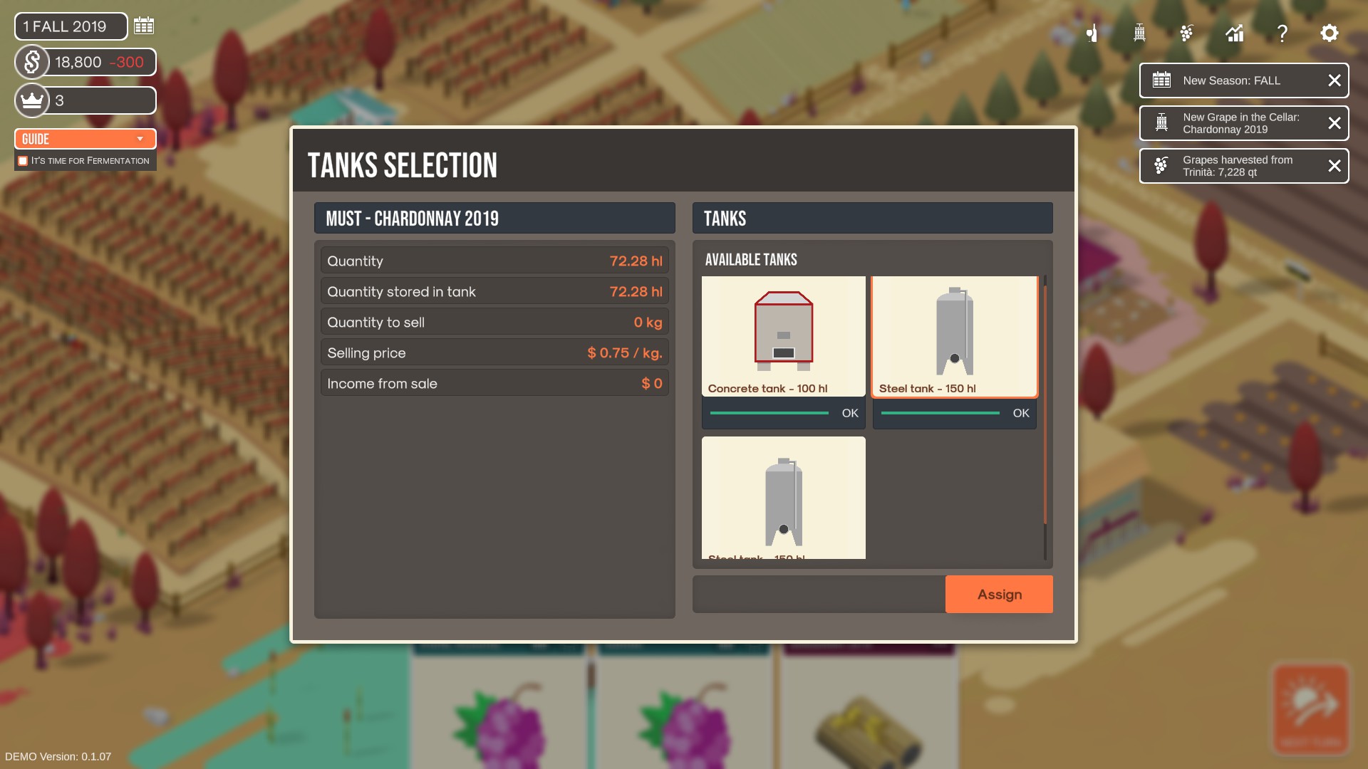 일정턴이 지나면 수확을 할 수 있고, 수확한 포도들을 저장할 탱크를 고를 수 있습니다. 데모판 기준으로는 탱크 재질에 따른 저장용량 변화만 있고 별다른 특이사항이 없었습니다.