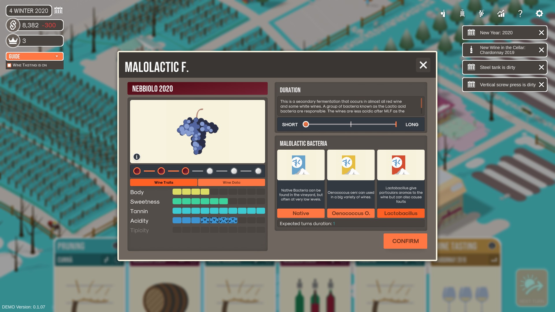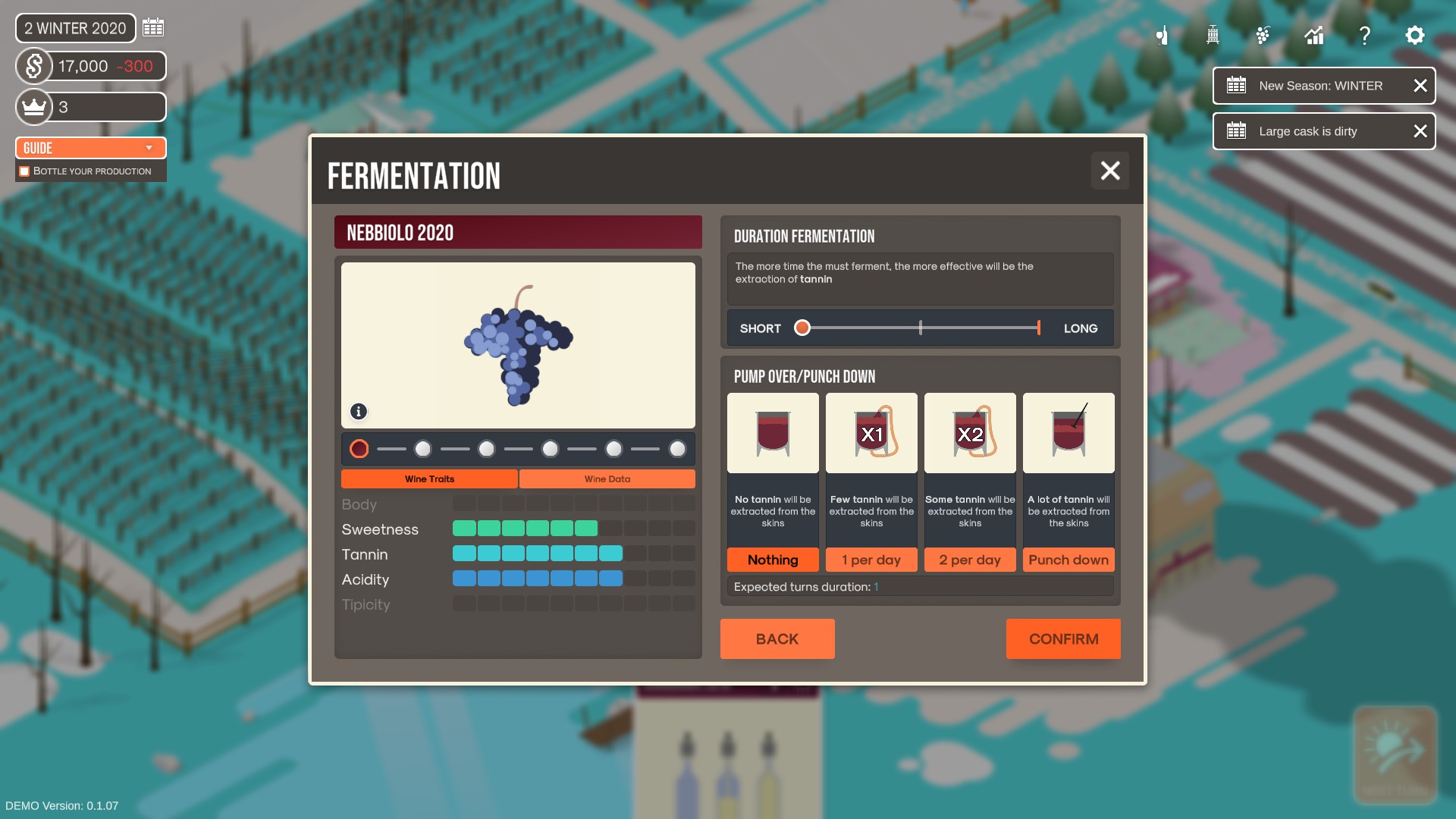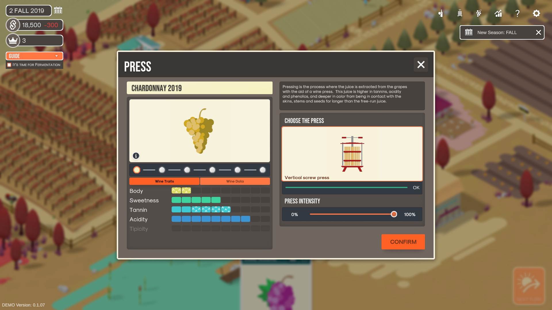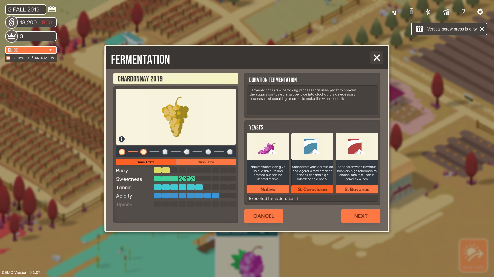 와인은 토지(제초 등을 포함), 수확 과정, 압착, 효모, 발효 등의 과정에 따라서 바디, 당도, 탄닌, 산미, tipicity=특성(의역), 5가지 수치가 달라지게 됩니다. 데모판은 1년만에 끝나서 그런건지 tipicity 항목이 잠겨 있었습니다.
