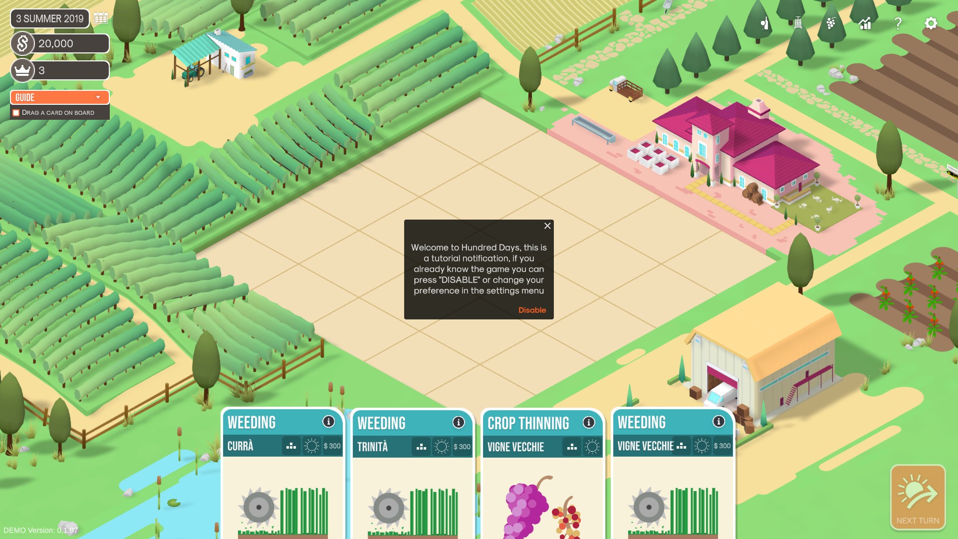 시작하면 5X5의 정방형 타일이 주어집니다. 스샷처럼 1턴마다 정해진 카드(행동)를 얻게 되고, 그 카드를 타일에 배치할 수 있습니다. 데모판 기준으로는 땅이 매우 좁습니다만 나중에는 땅을 확장할 수 있을 것 같습니다.
