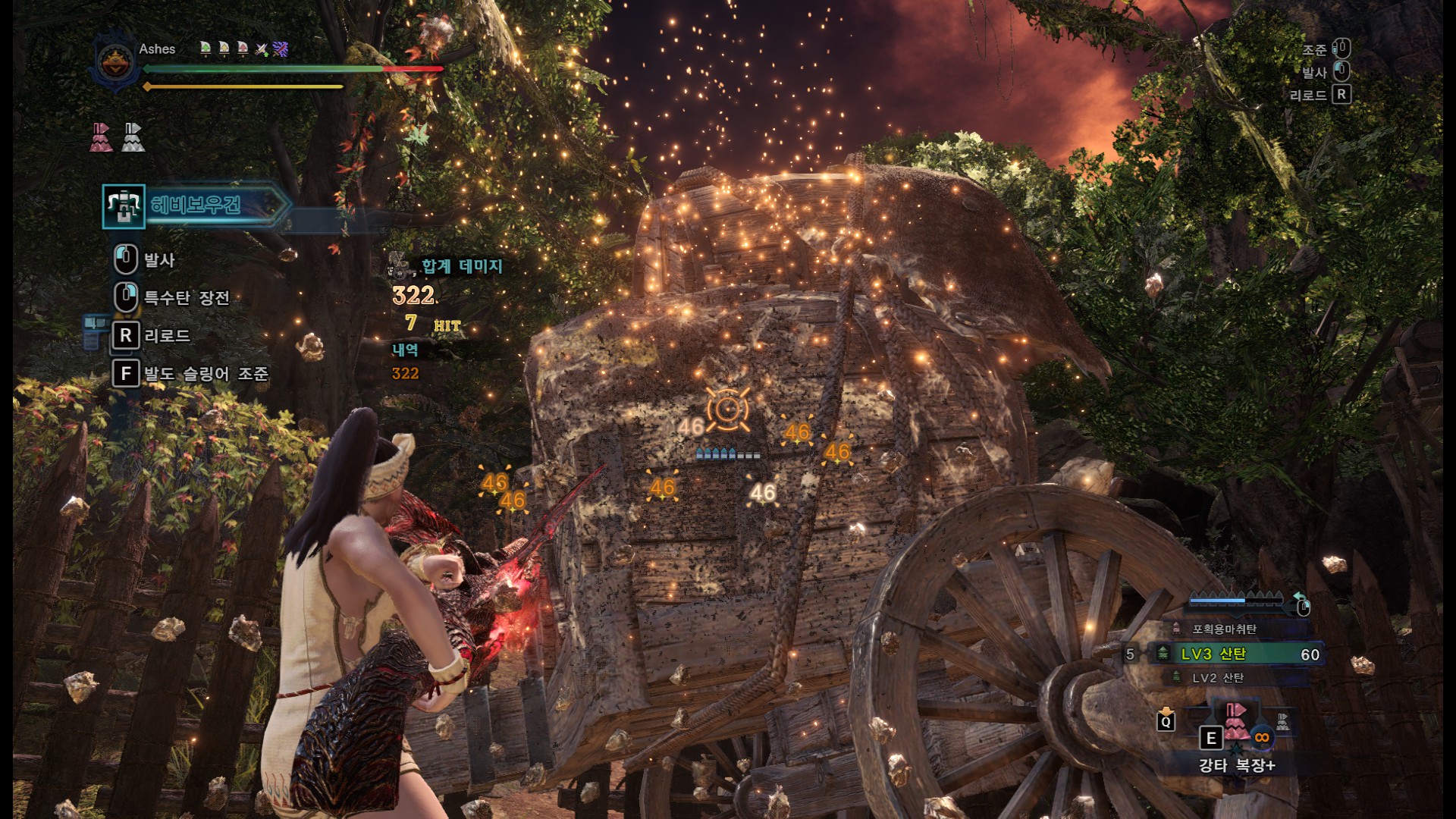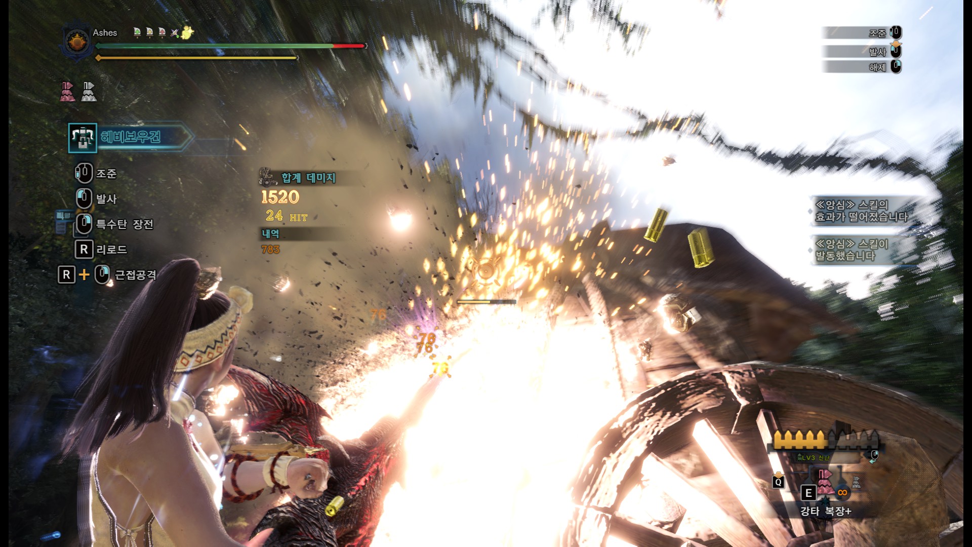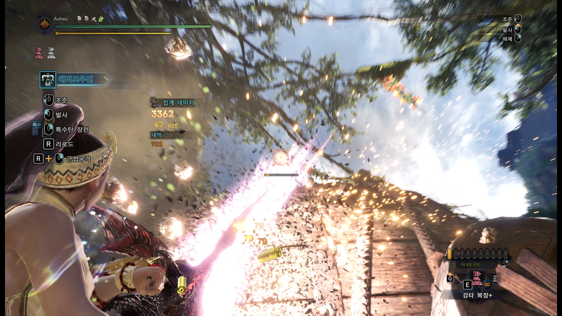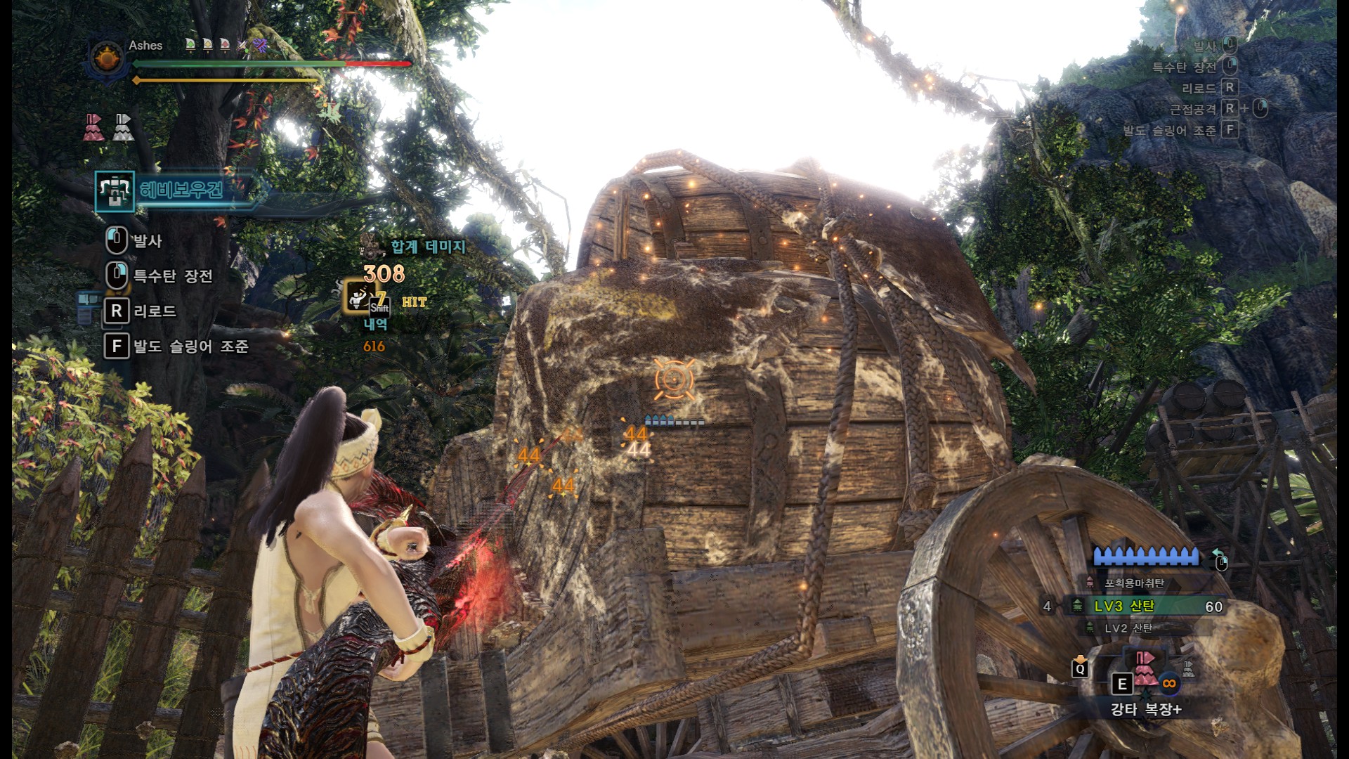 특사주1 적용, 기관용탄 테스트. 기관용탄은 초근접해서 쏘는게 딜이 가장 잘나오네요. 그런데 리어카는 짐받이 부분이나 바퀴부분에 총알이 닿으면 딜이 떨어지고, 실제 몬스터의 약점부위는 리어카보다 작으면서, 육질도 낮은 경우가 있기 때문에 실제 딜과는 거리가 좀 있을겁니다. 참고용으로만 봐주세요. 리어카 기준 가장 잘나올때는 79, 가장 낮게 나오면 30대 데미지가 뜹니다. 위 사진은 처음에 약간 떨어져서 쏘다가 몇발이 30대 데미지가 떠서 앞으로 전진해서 우상향으로쐈습니다. 1틱당 최대 데미지 79. 79X50=3950