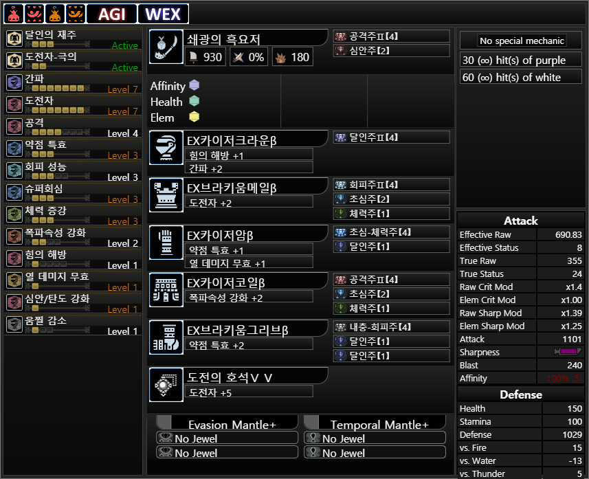 간파를 낮추는 것도 괜찮을 것 같긴 한데, 참모아 크리가 안뜨면 기분이 안좋아지기 때문에 간파7을 넣었습니다. 아니면 활공복장+나 어쌔신 복장+에 달인주를 넣고, 방어구에서 달인주를 약간 덜어내는 식으로 써도 될 것 같네요.