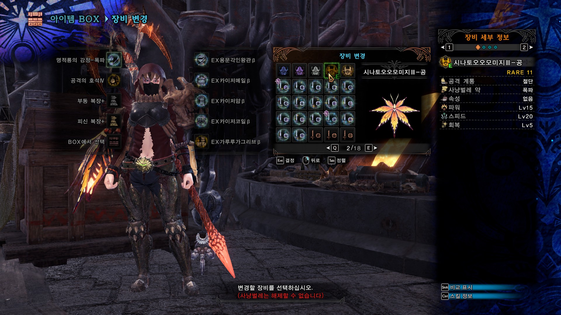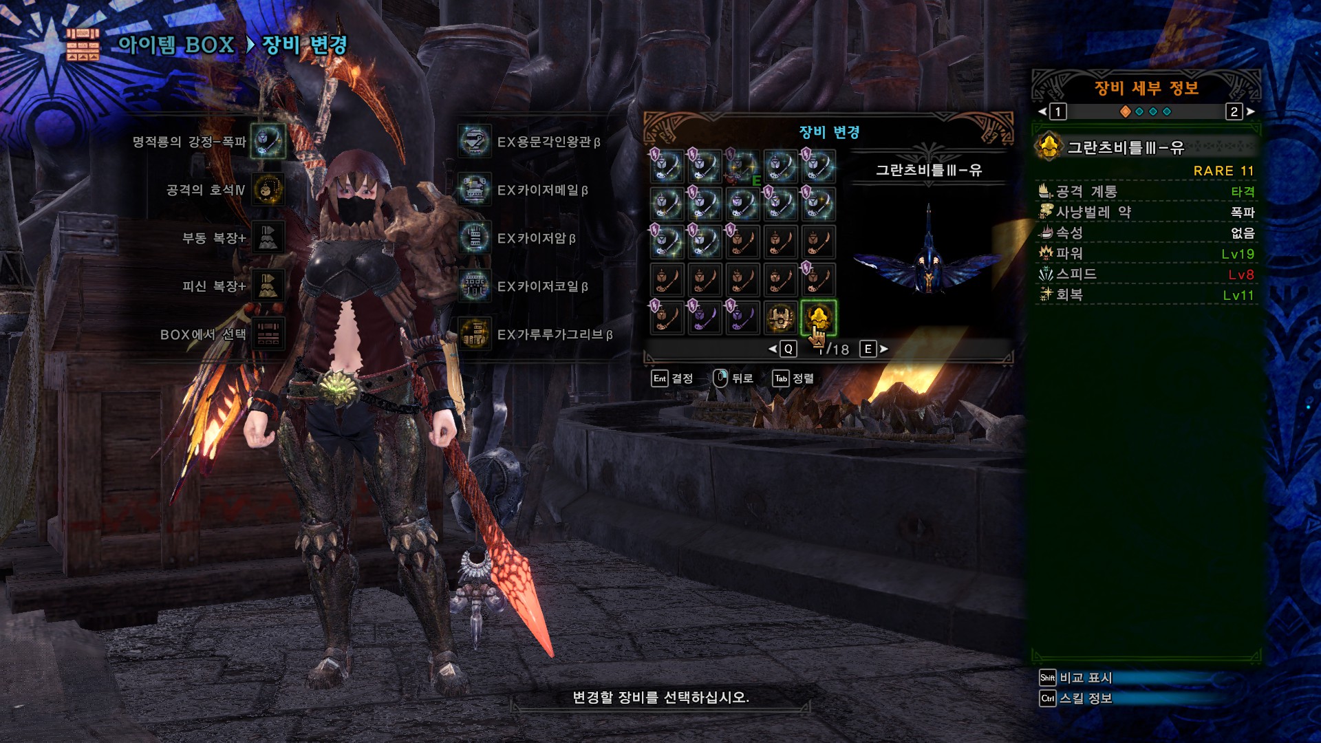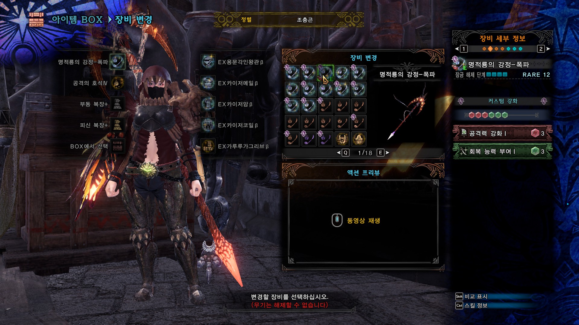 무기 커강은 회복, 회심, 속성강화로 했는데 취향이나 넣을 스킬에 따라서 회복, 공격, 속성강화(또는 방어)로 해도 될 것 같습니다.