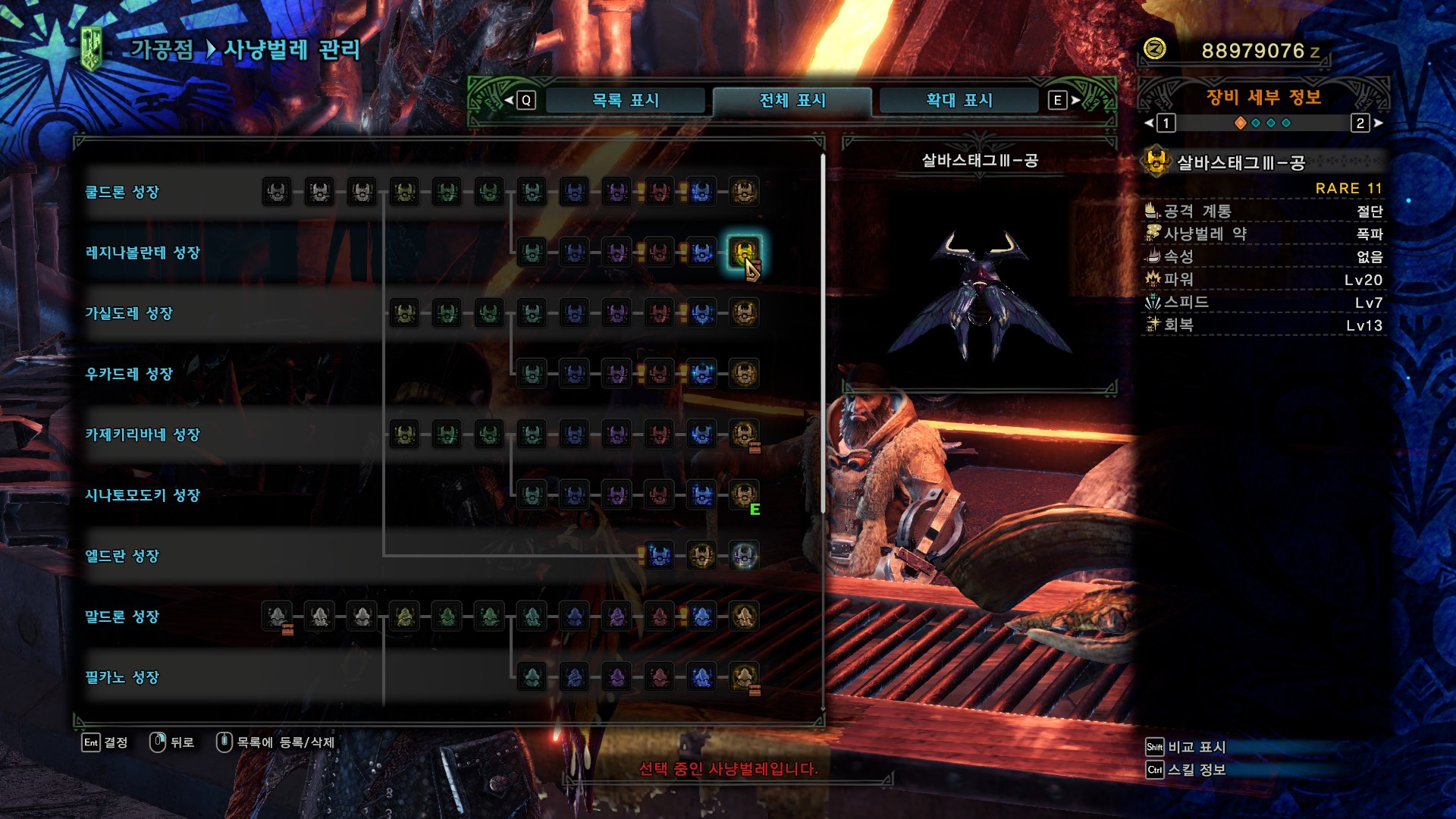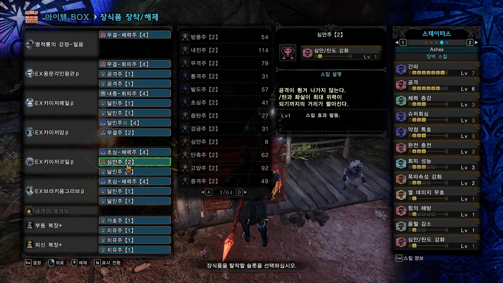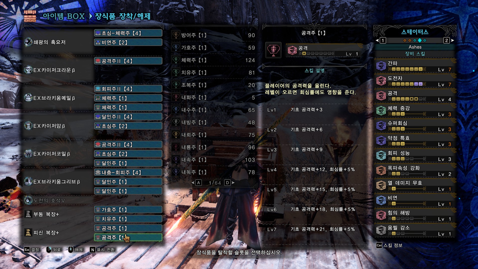 무기 커강은 회복, 회심, 속성강화로 했는데 취향이나 넣을 스킬에 따라서 회복, 공격, 속성강화(또는 방어)로 해도 될 것 같습니다.