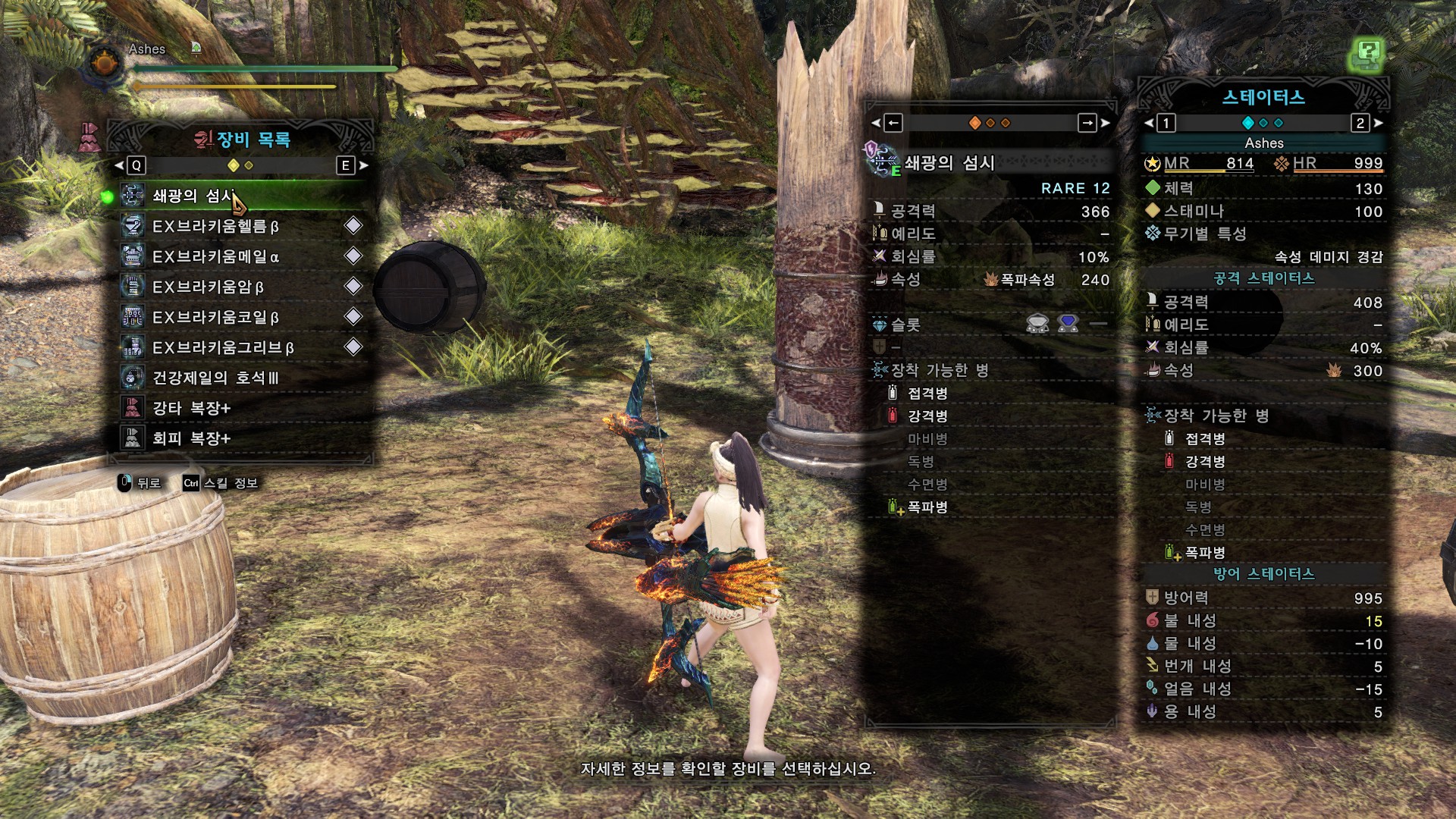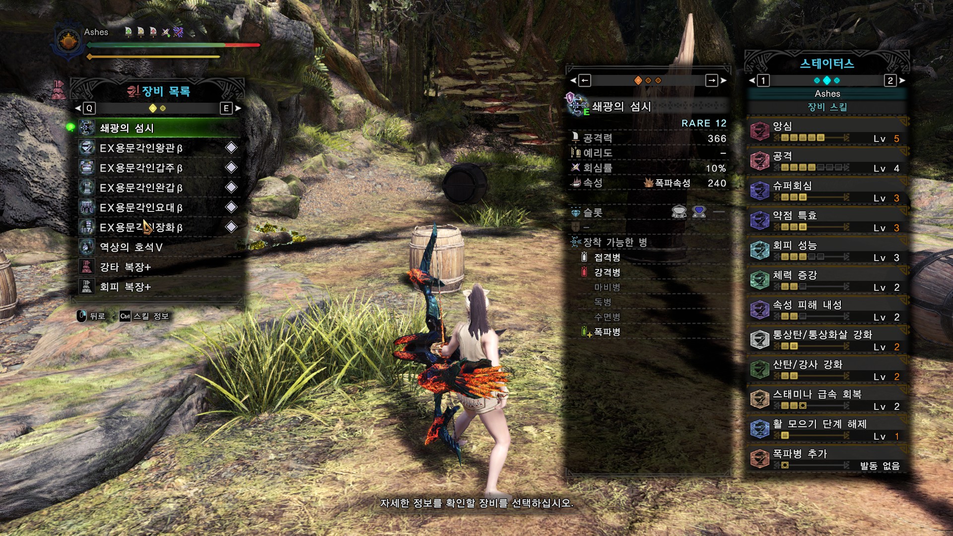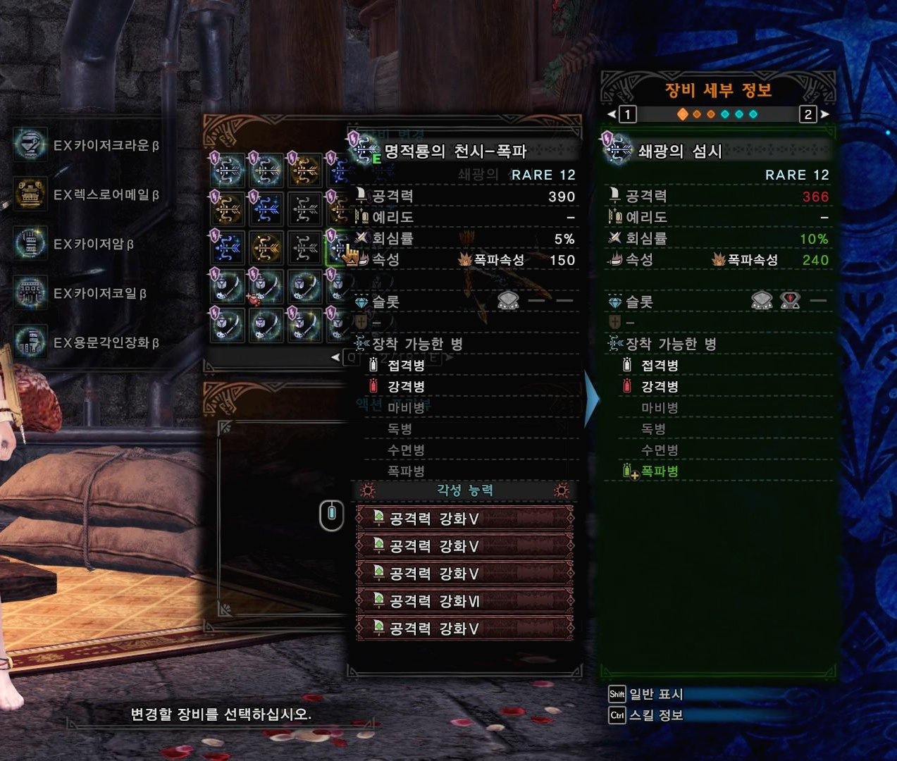 무기의 기초 공격력부터 꽤 차이가 나기 때문에 똑같은 방어구, 똑같은 스킬셋이라면 쇄광의 섬시가 무페토 폭파활을 당연히 이길 수가 없습니다. 그러면 방어구와 스킬셋을 바꿔본다면?