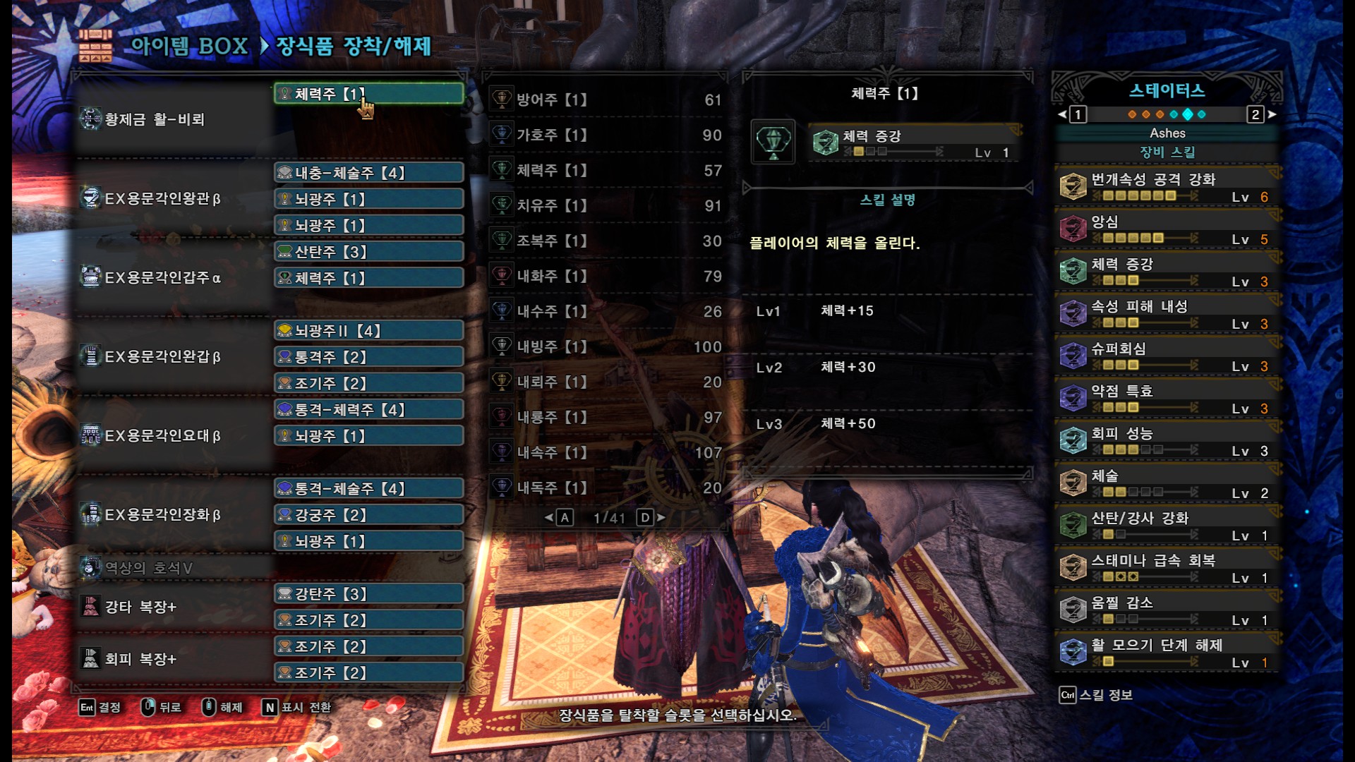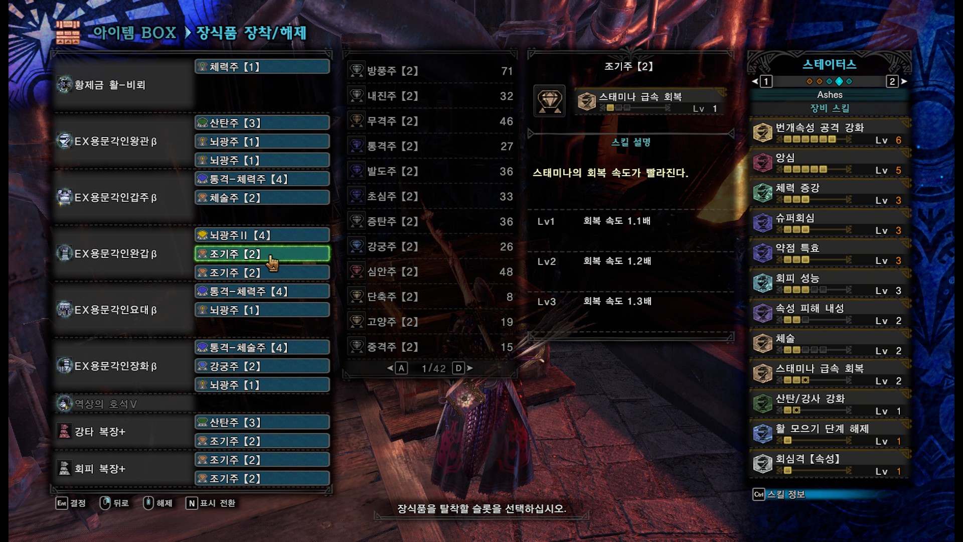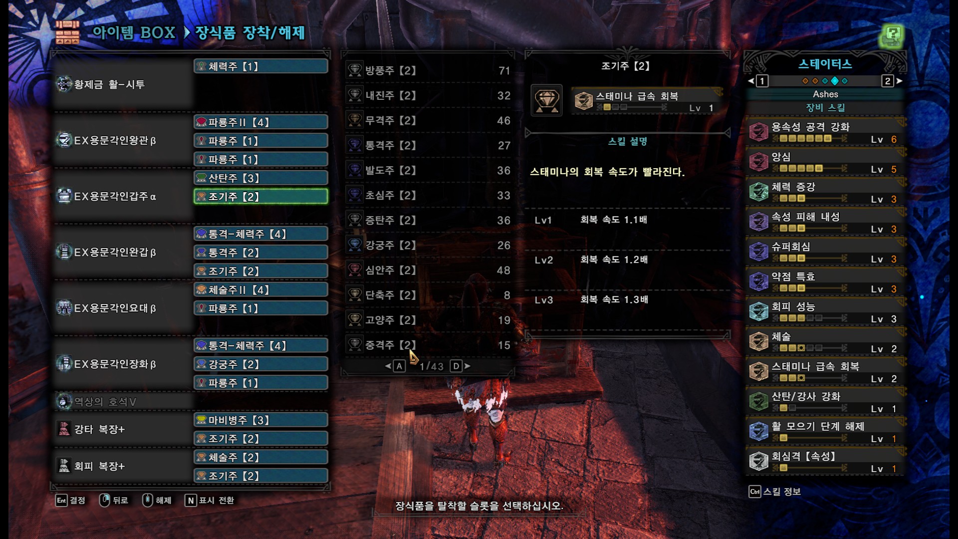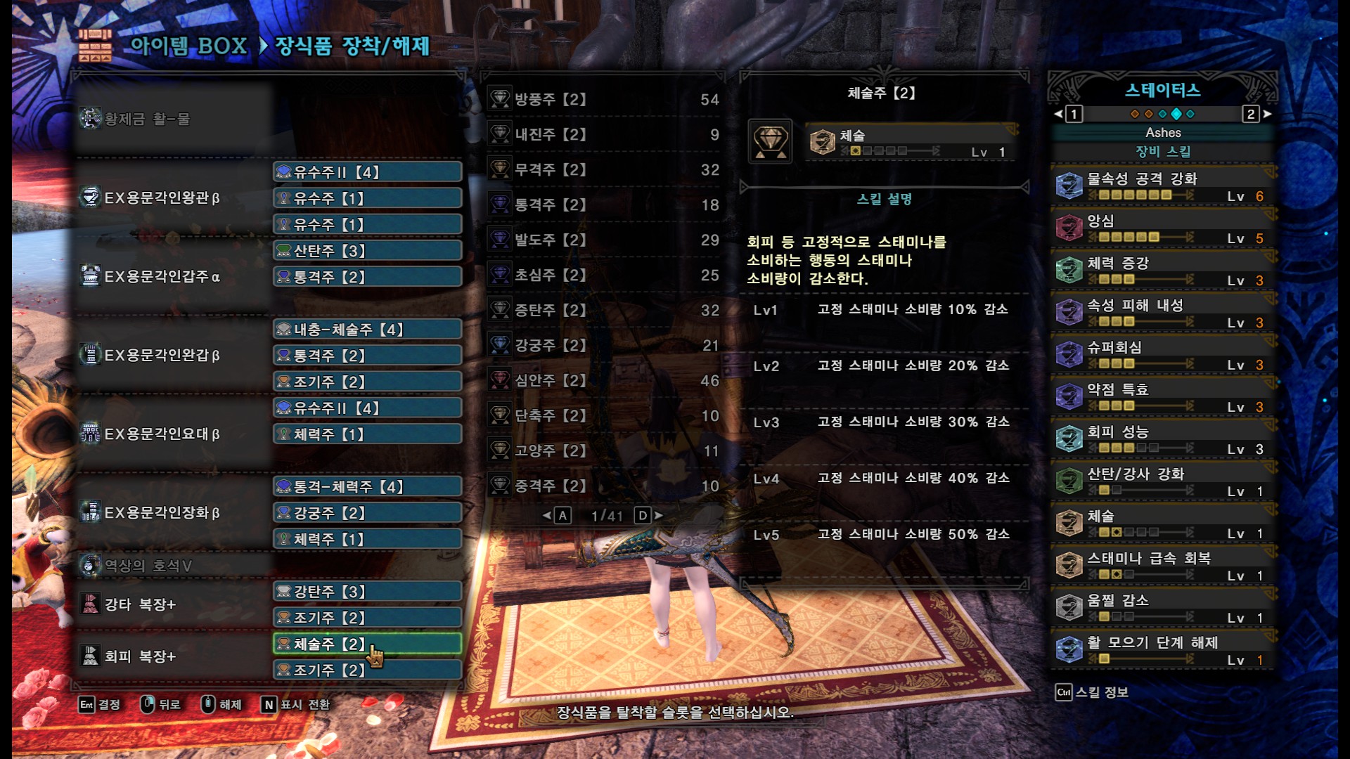 체술1이 커스텀은 한번 죽으면 스태미너 관리가 매우 힘들어지기 때문에, 활공복장에 체술II 장식주나 체술 복합 장식주를 넣는 것도 괜찮습니다.