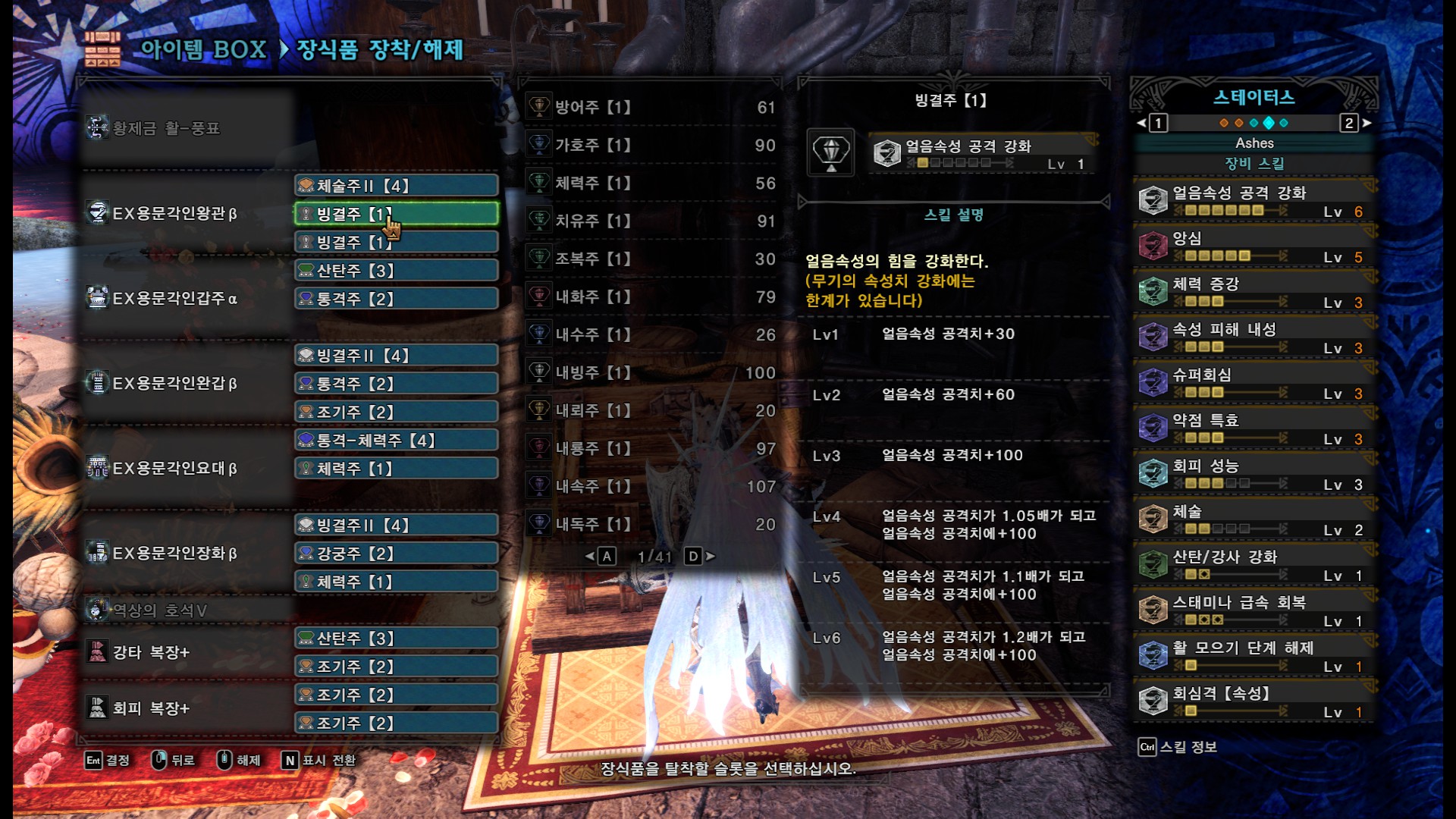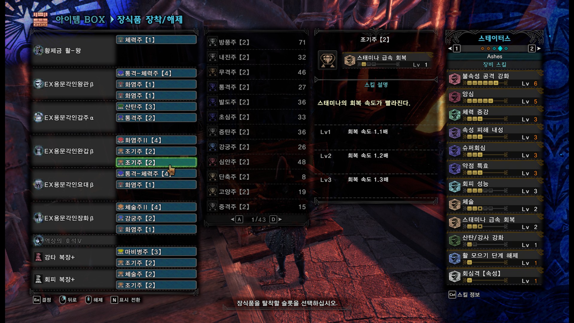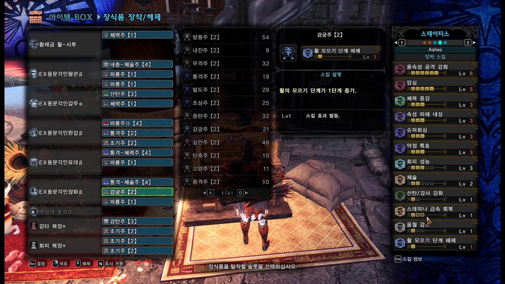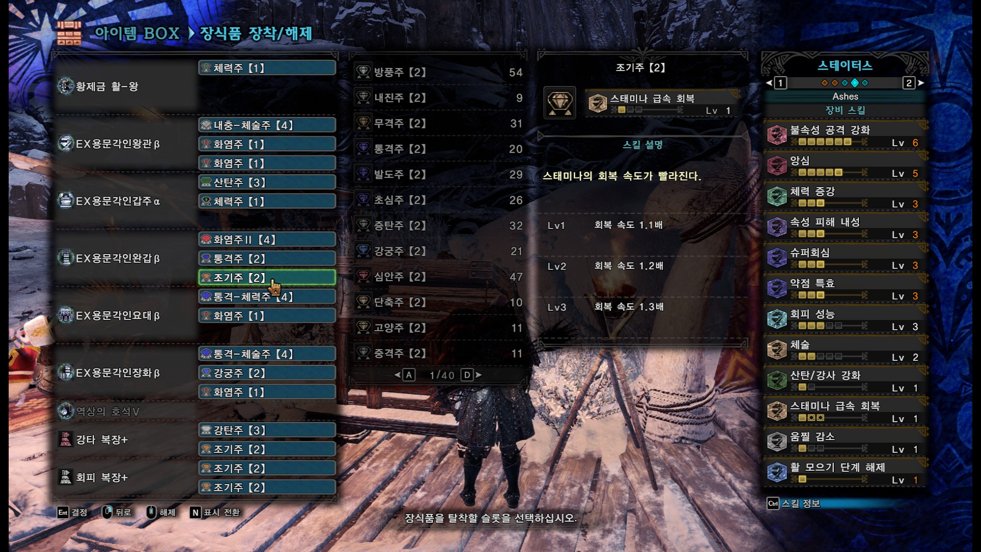 체술1이 커스텀은 한번 죽으면 스태미너 관리가 매우 힘들어지기 때문에, 활공복장에 체술II 장식주나 체술 복합 장식주를 넣는 것도 괜찮습니다.