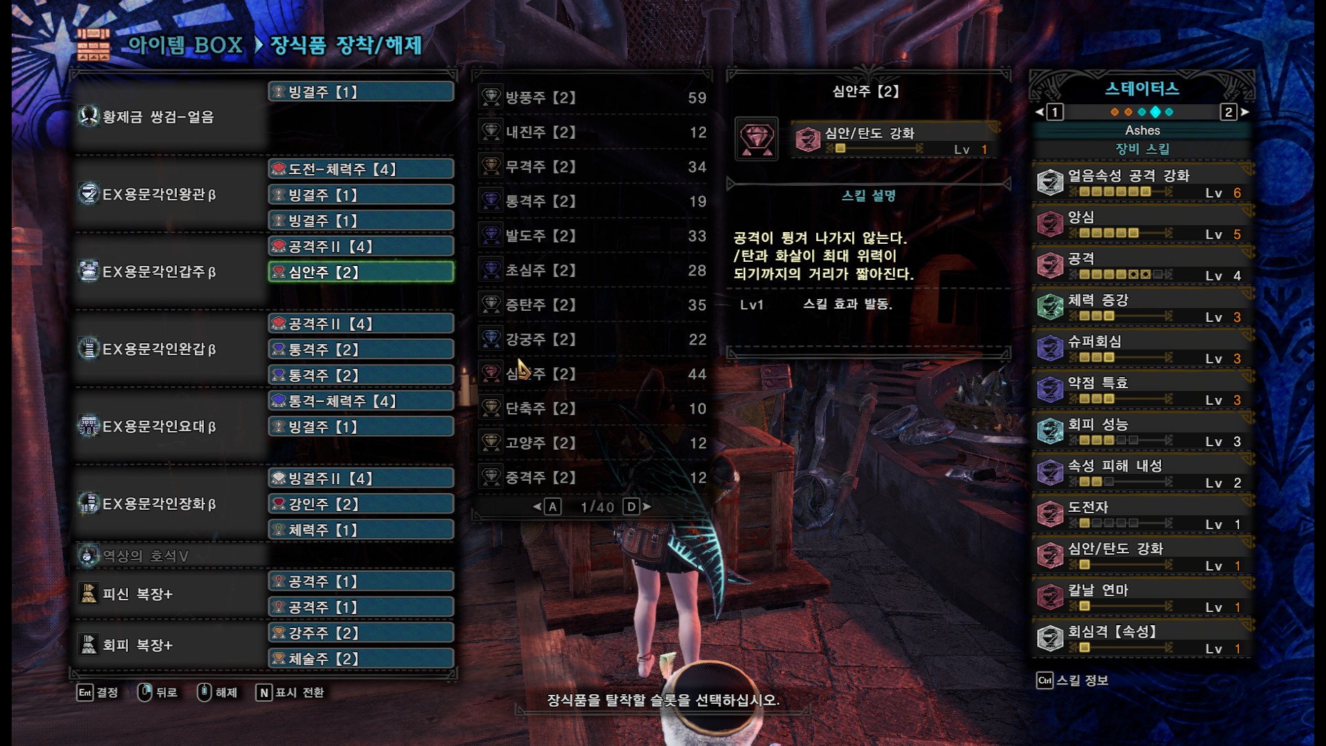 키린의 경우 상시 분노 수준이라서 도전자의 효율이 매우 좋습니다. 그 외의 몬스터라면 일단 공격을 최대한 채운 후에 도전자, 앙심 등을 챙기세요.