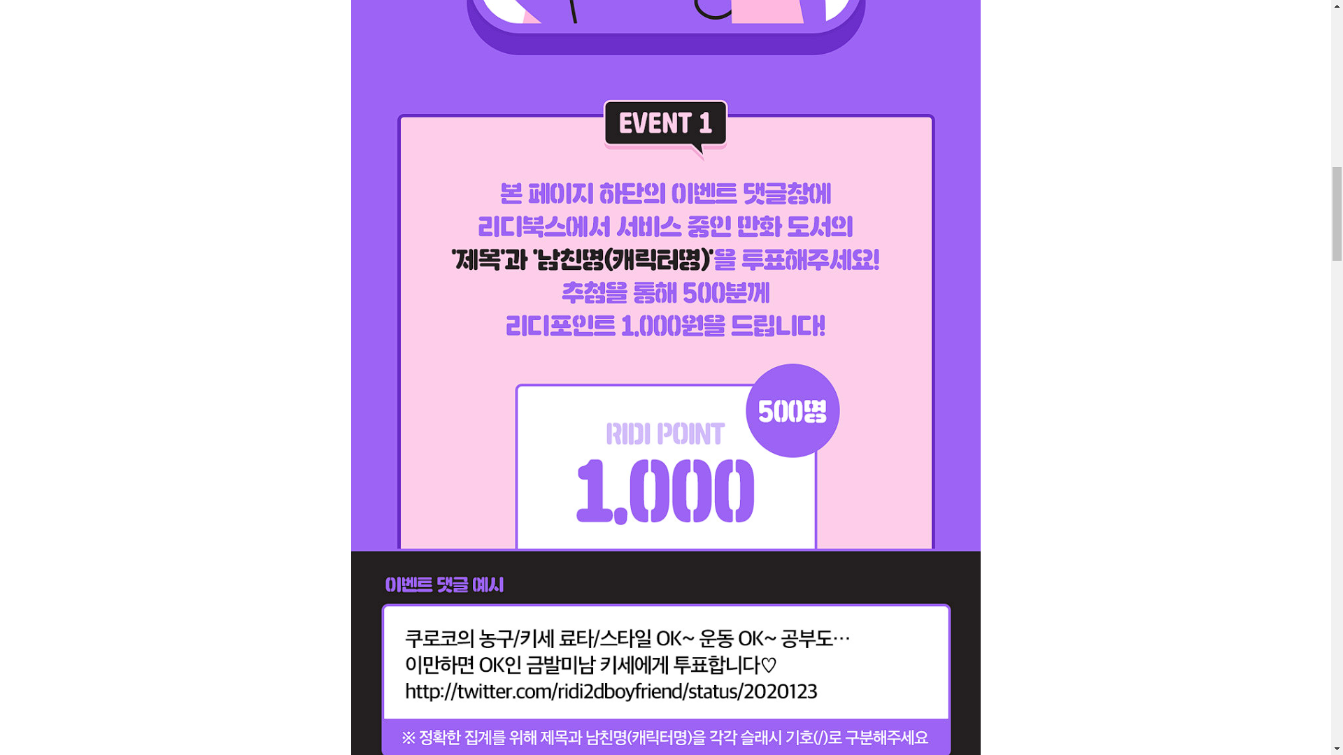 「차원」이 다른 당신의 남친에게 지금 바로 투표하세요♥ 혜택1. 하단의 이벤트 댓글창에 리디북스에서 서비스 중인 만화 도서의 '제목'과 '남친명(캐릭터명)'을 투표해주세요! 추첨을 통해 포인트 증정! 혜택2. 2D남친랭킹대회를 트위터에 홍보해주세요! 추첨을 통해 포인트 증정!