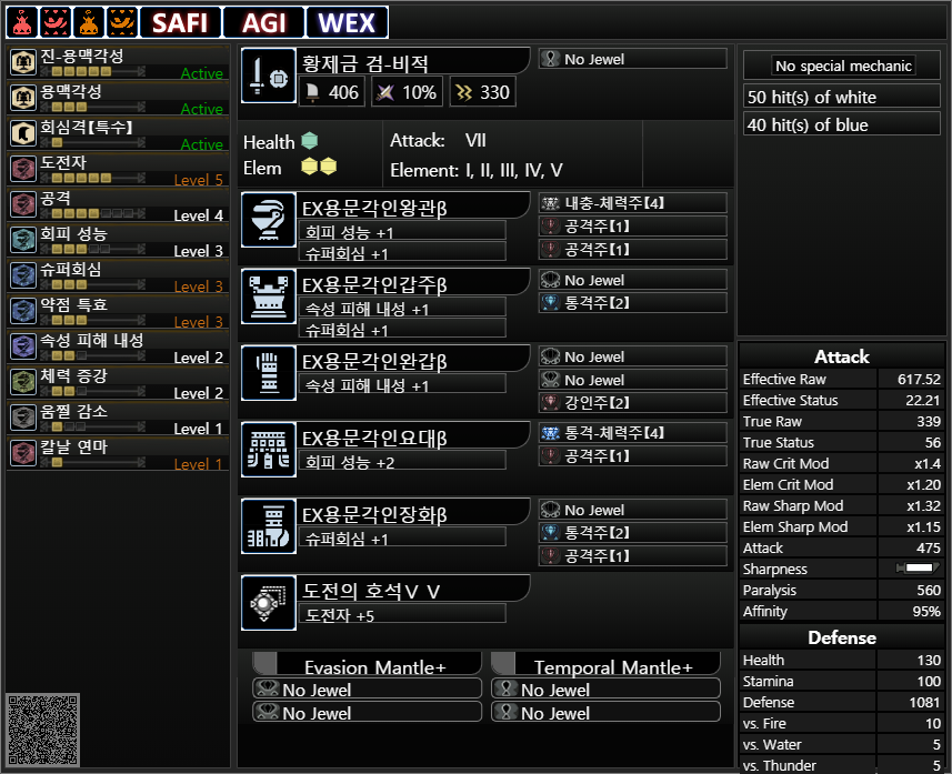 이것저것 커스텀을 짜서 시뮬을 돌려봤는데, 일반적으로는 용문5셋, 달재, 달재+속성가속 커스텀 중에서 용문5셋+속성강화 커스텀이 가장 쎕니다.(얼음연성 황제금 손검은 또 어떨지 모르겠지만) 폴배쉬(저스트러쉬의 경우 초반의 방패공격이라거나)의 경우 방패치기에는 속성딜 비중이 0이라서, 달재+깡공 세팅보다 딜이 떨어지지만 그 외의 사과깎기 저스트러쉬 딜은 용문5셋이 우세. 문제는 세팅에 칼날연마를 넣어야 하기 때문에, 칼 가는 타이밍이 안나온다면 이도저도 안될 수 있습니다. 대경직이나 클러치 경직을 잘 못뽑아낸다면, 상처유지도 안되고 예리도도 떨어져서 용문5셋을 맞춘 의미가 없어질 수도 있다는 뜻입니다.