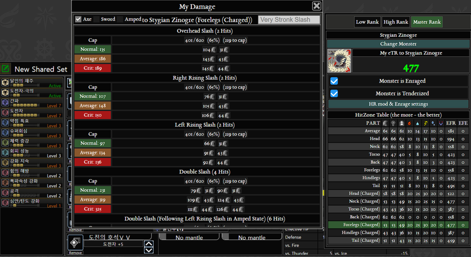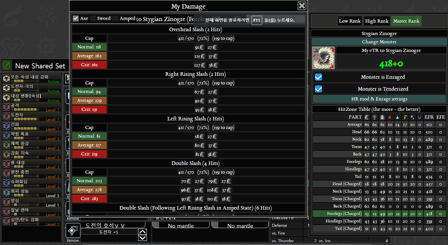 오버 회심이 과하다 싶으면 간파를 적당히 낮추는 것도 좋습니다. 머리에 매달리기 힘든 몬스터라거나(세번 돌리고 무기 공격하기 어려운), 도전자 업타임이 짧다면 간파 7을 추천하고 그 외의 경우라면 간파를 두세개 빼세요.