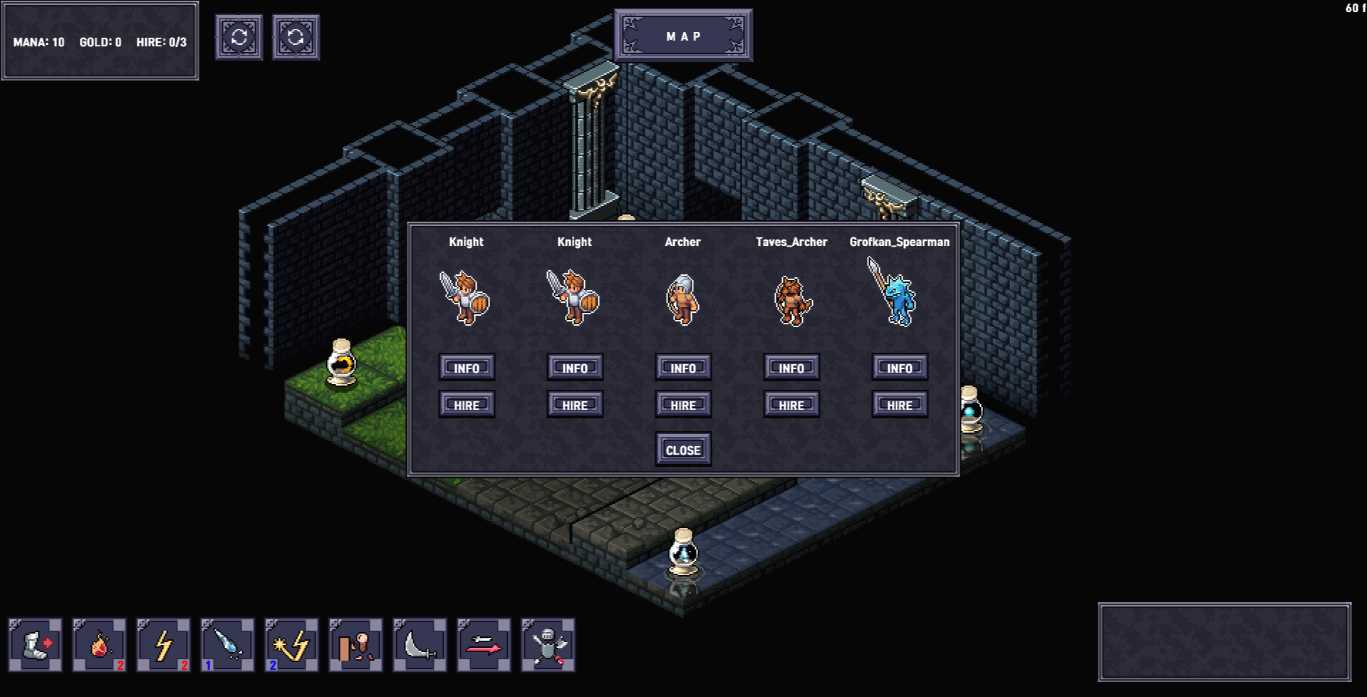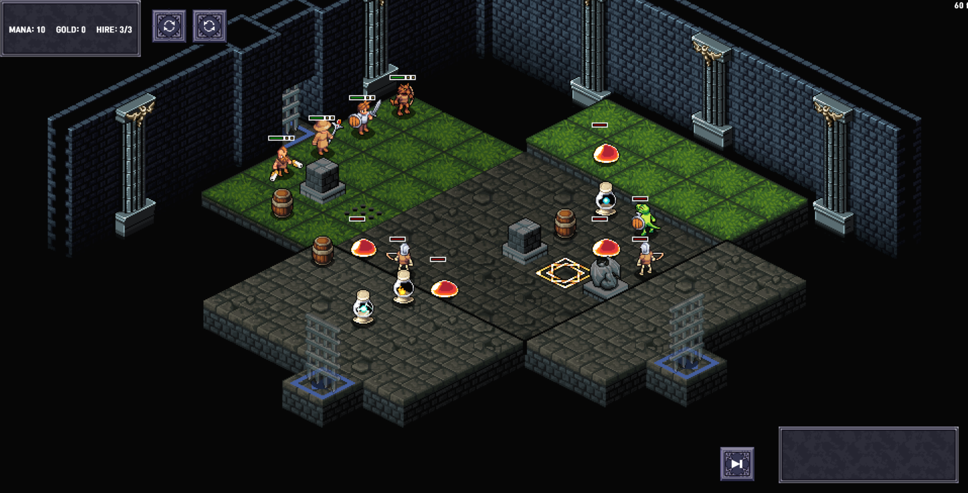 화면만 보면 엄청나게 단순해 보이시겠지만, 퍼즐적인 요소(마법, 지형)가 적절히 섞여있기 때문에 보기보다 깊이 있는 전투가 가능합니다. 서로 죽창딜을 꽂을 수 있어서 마법과 스킬, 함정, 지형을 적절하게 이용해야 하죠.