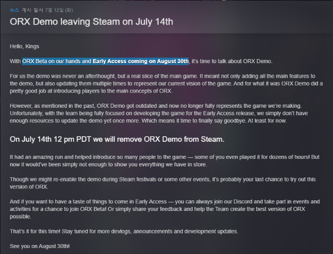 공지로는 7월 14일에 데모를 내린다고 했는데, 아직까지는 데모 플레이가 가능합니다(한국어는 미지원). 8월 말에 출시되는 얼리억세스의 경우 공식 한국어를 지원하며, 가격은 아직까지 밝혀진게 없습니다.