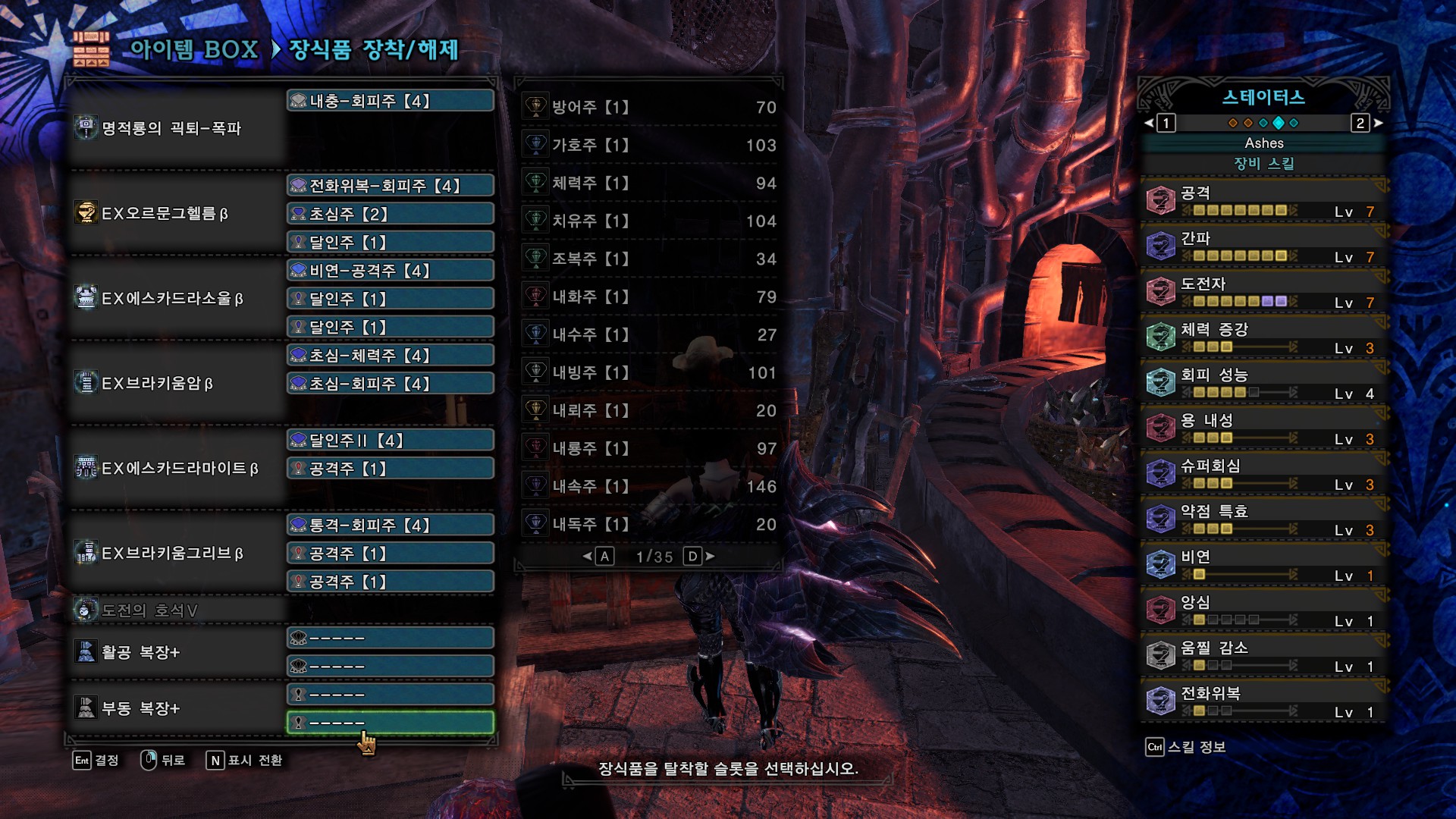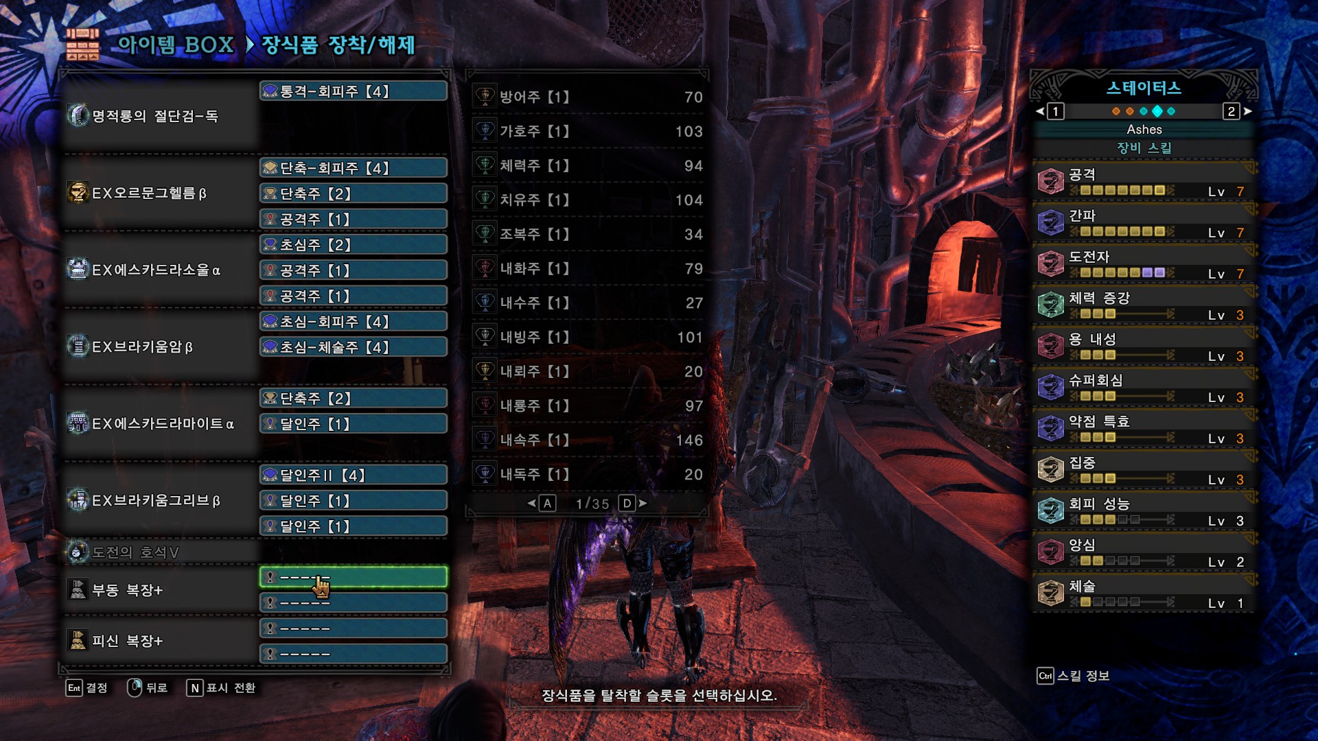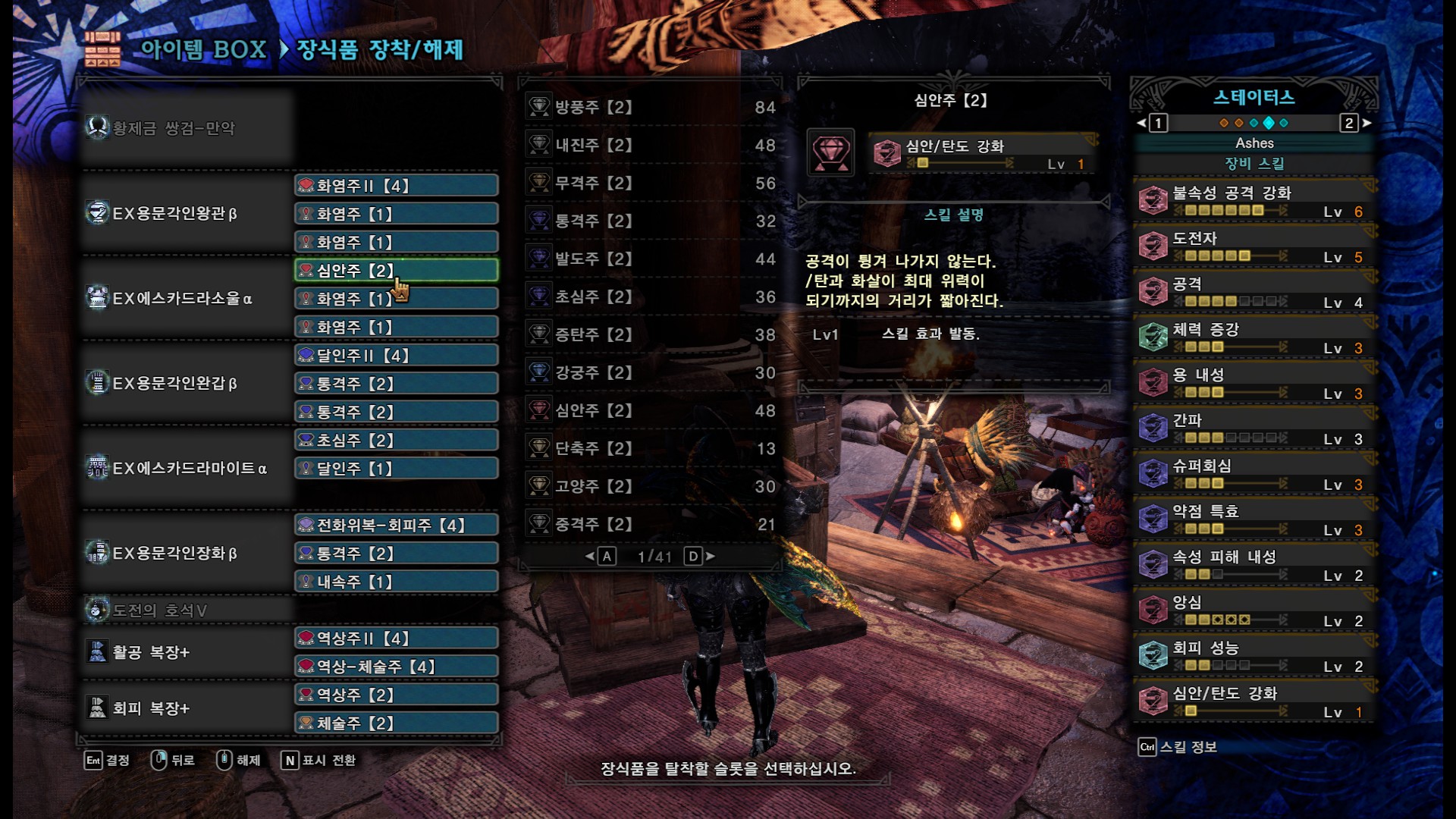 깡공이 더 중요한 몬스터라면 에스카드라3셋+브라키움2셋도 괜찮을 것 같습니다. 다들 아시겠지만 도전자5>7로 바꾸면 깡공이 8 더 오르고, 전화위복이 발동되면 기초공+12입니다. 몬스터의 상태이상 공격유무, 분노상태 유지 유무에 따라서 유동적으로 수정하세요.