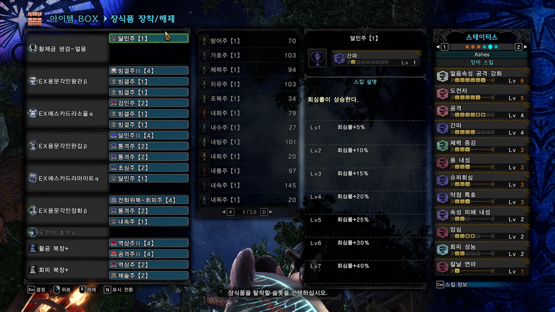 약점 기준 회심(상처) : 25 5 20 20 30(20)=100(120), 도전자 발동시 추가회심 발생, 몬스터나 필요에 따라서 회심 커강을 공격 또는 속성 커강으로 바꾸셔도 됩니다. 아니면 회심 간파를 낮추셔도 되고요.
