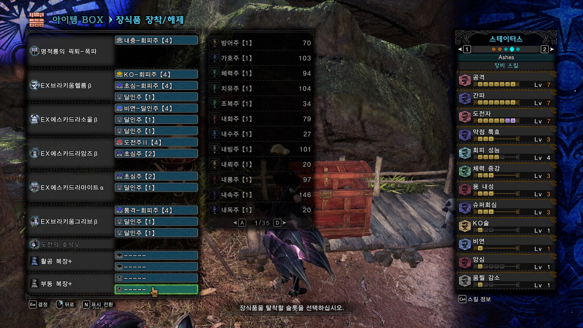 약점 기준 회심(상처) : 15 5 20 15 30(20)=85(105), 도전자 발동시 추가회심 발생, 몬스터나 필요에 따라서 회심 커강을 공격 또는 속성 커강으로 바꾸셔도 됩니다. 아니면 회심 간파를 낮추셔도 되고요.