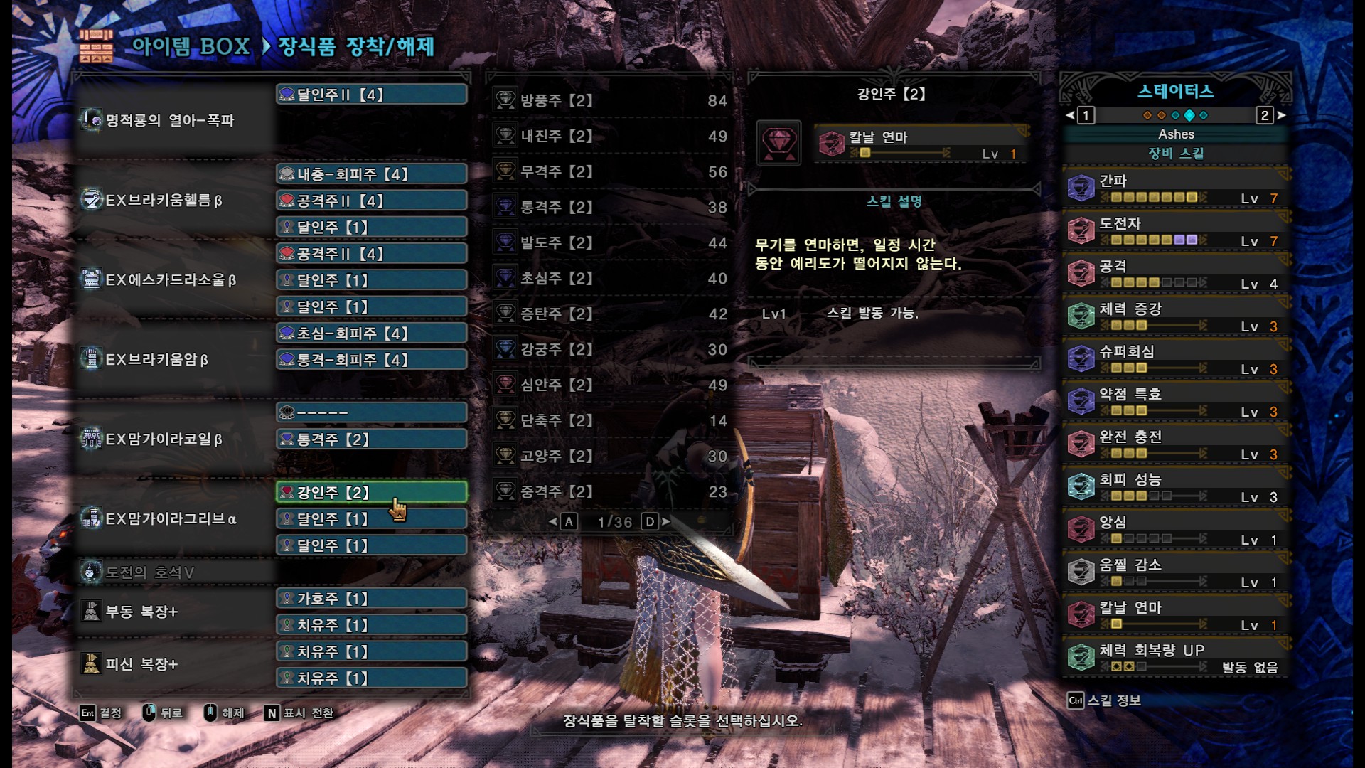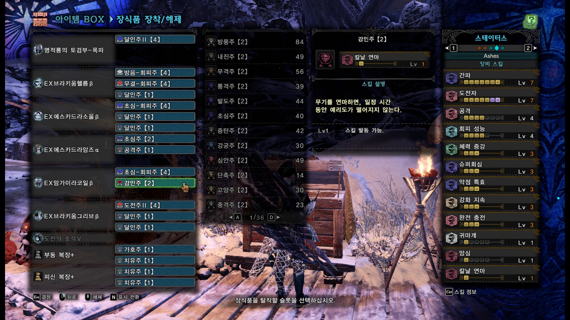 2슬롯이 하나 남는데, 심안주를 넣으면 많이 편해지는 몬스터(라잔, 은화금화룡, 얀가 등) 상대로 넣는 것도 좋을 것 같네요. 그 외 완전충전이나 속납주가 필요없다면 공격을 7까지 넣고, 추가적인 공격스킬을 더 넣을 수도 있습니다.