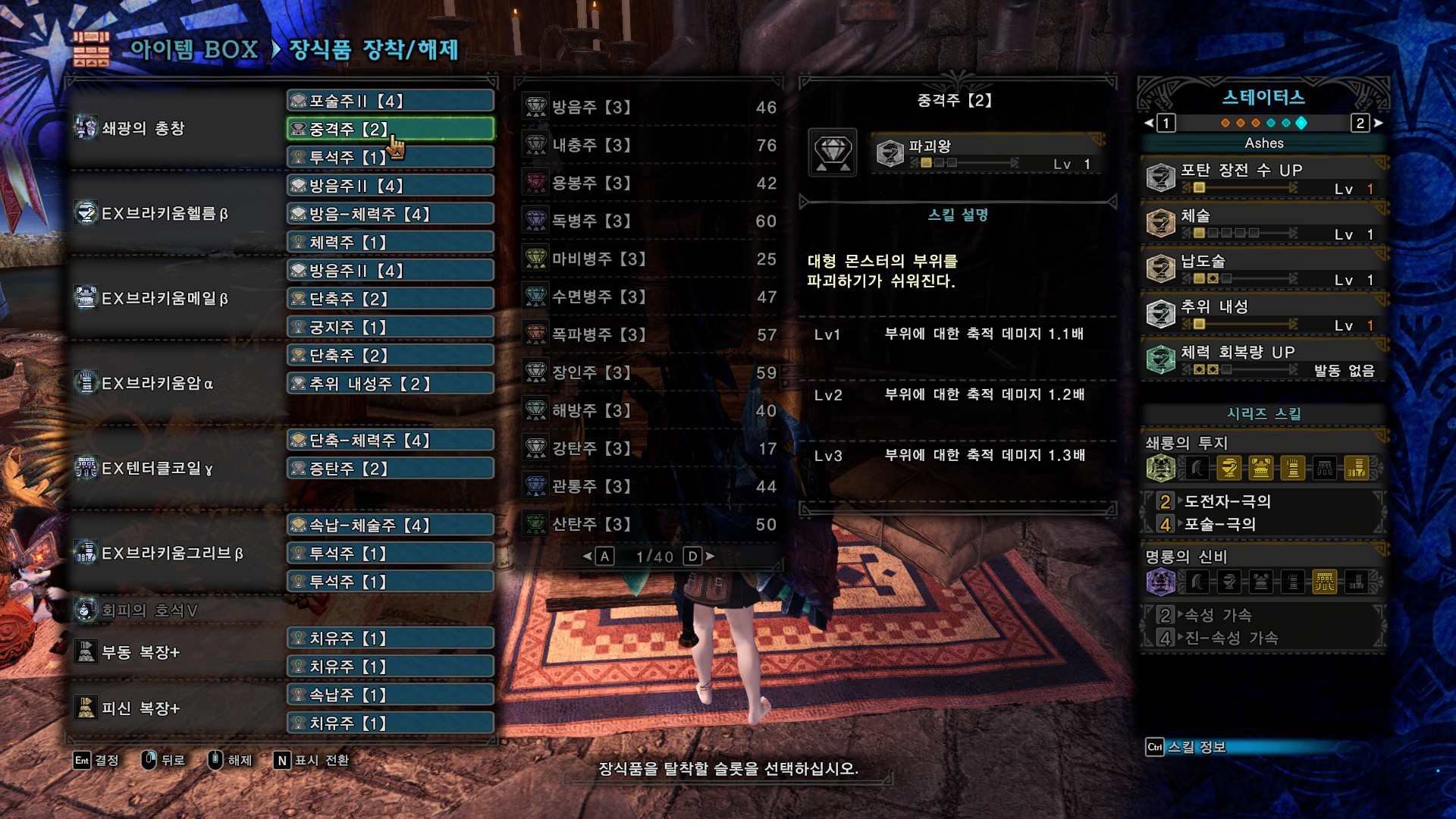 예전 영상에서 썼던 세팅에서 스킬이 살짝 바뀌었고, 아이루가 벽꿍 할 때 마비덫을 깔 때가 더러 있어서 덫도 병폭탄으로 교체했습니다.