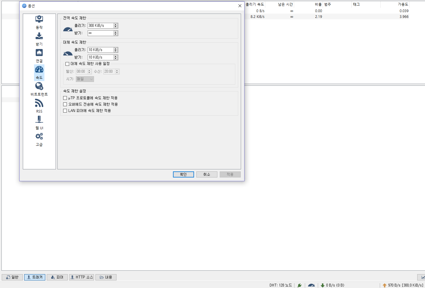 설정에서 속도>업로드 속도를 바꿔놔도 개별 토렌트의 속도는 그 설정을 안따라가는데...