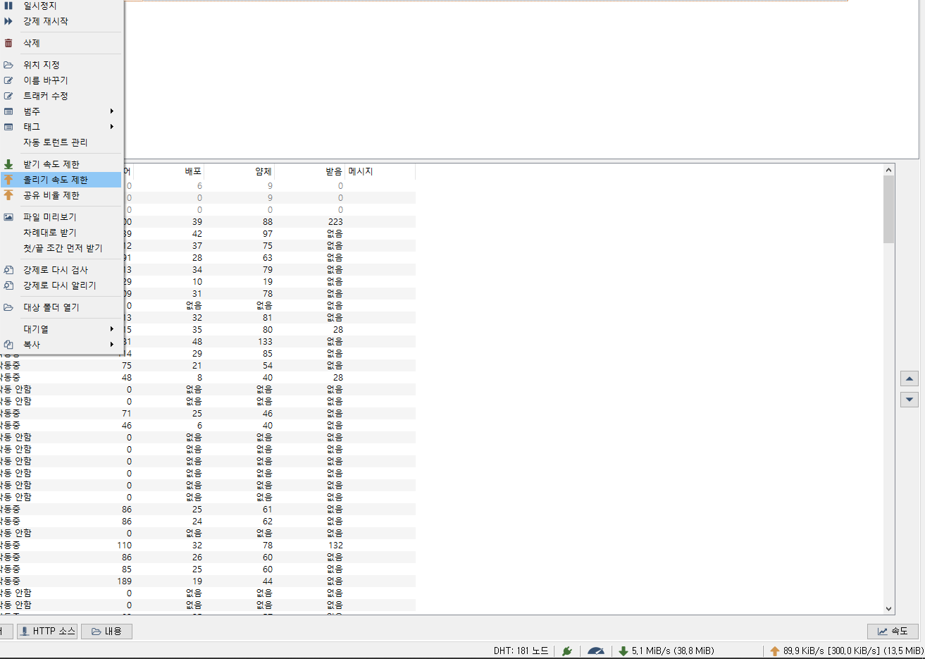 그럴 때 업로드 속도를 제한하고 싶다면 설정에서 업로드 속도를 낮춘 후에, 개별 토렌트 우클릭>올리기 속도 제한>업로드 속도를 설정해주시면 됩니다.