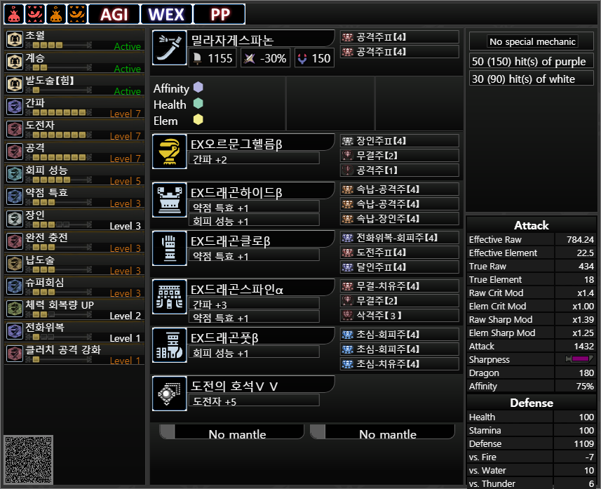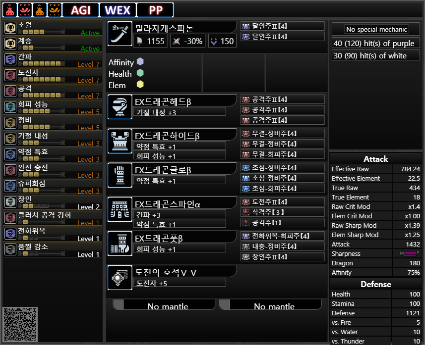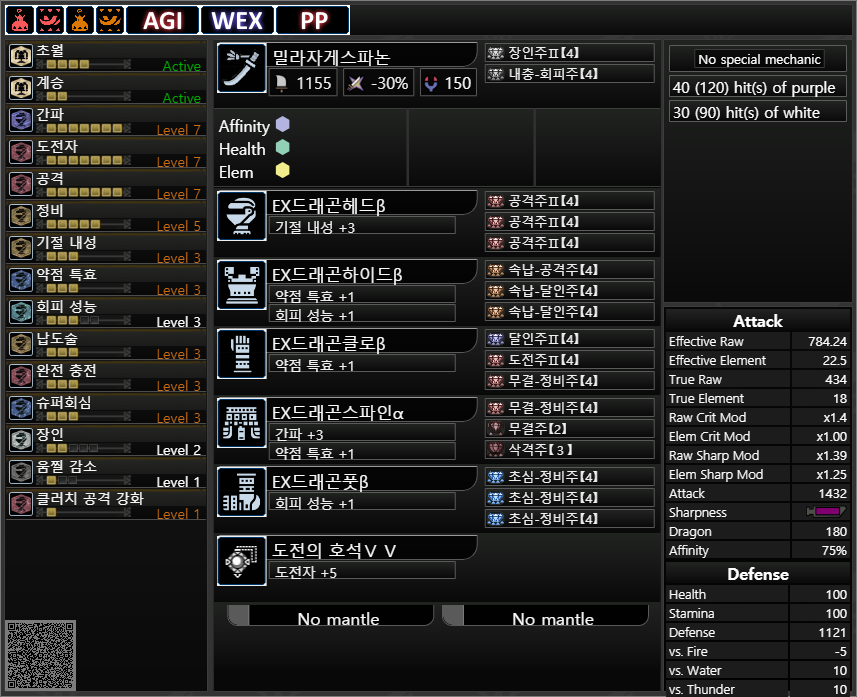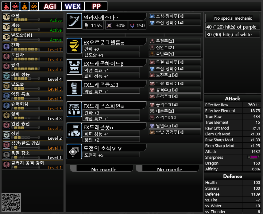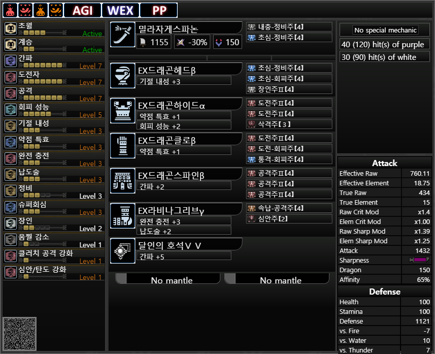 약점 기준 회심 : -20 25 5 30=40%+상처부위 공격시 20%추가, 몬스터 분노시 20%추가, 혼신 발동시 40%추가