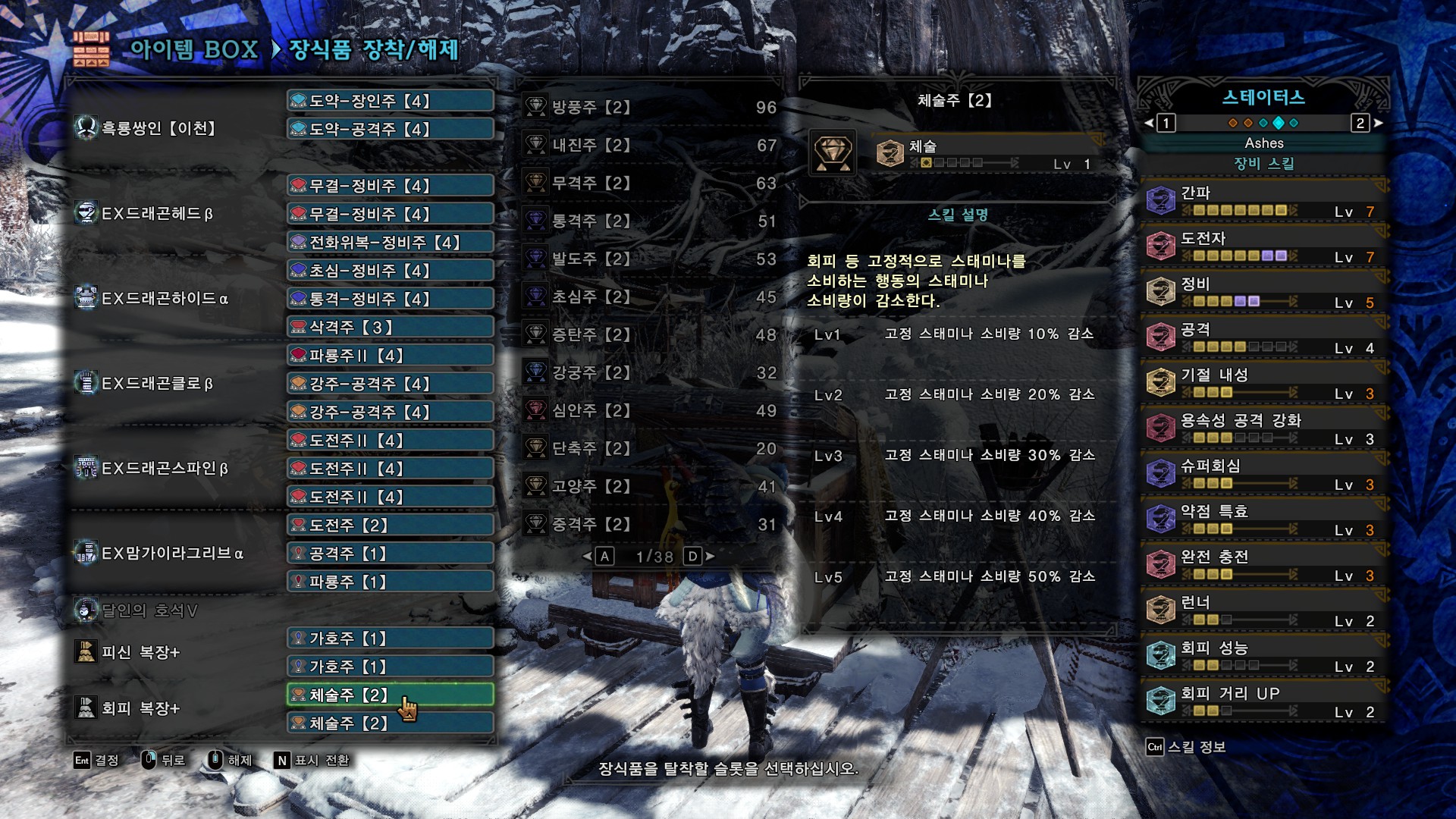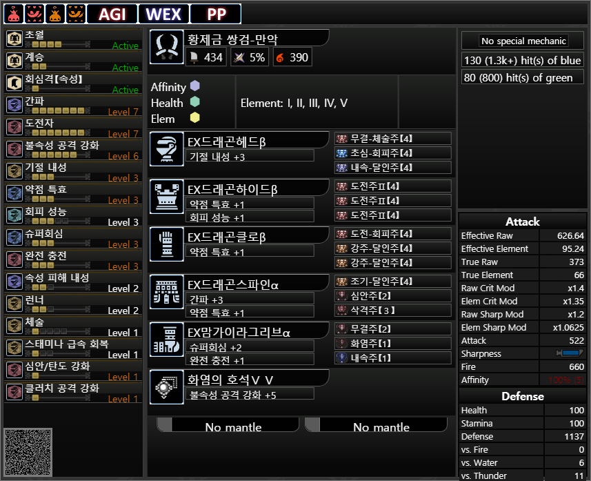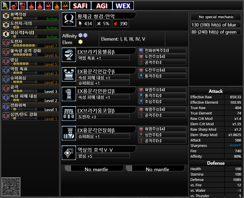 약점 기준 회심 : 105%, 분노시 20%추가. 5%가 거슬리면 간파1을 빼고 공격4를..어떻게 넣으면 될 것 같기도 하네요.