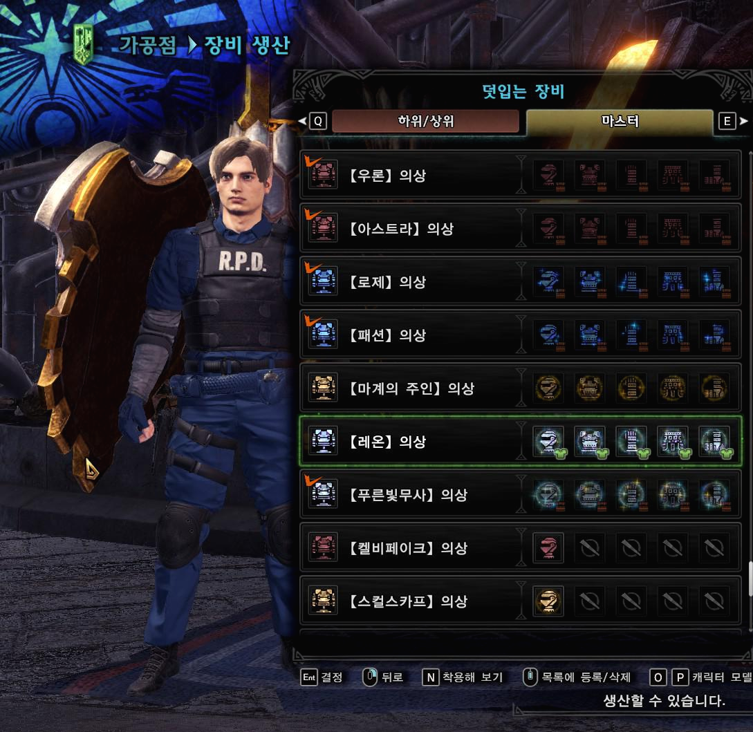 레온 의상 : 뇌랑룡 티켓 1매, S.T.A.R.S 뱃지 6개 필요. 스타즈 뱃지는 이벤트 죽발하 퀘스트 보상으로 얻을 수 있습니다.