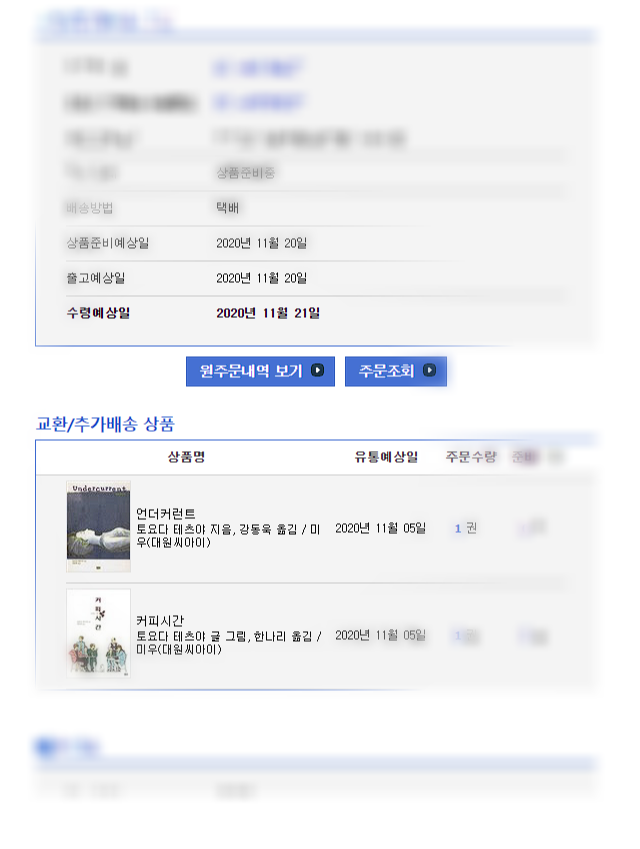 전량 파본으로 확정났기 때문에(언더커런트보다 커피시간 인쇄상태가 더 안좋은 것 같습니다), 구매한 사이트에서 교환 신청을 넣고 기다리시면 됩니다. 교환 신청하고 약간 기다리니까 카톡이랑 메일로 연락이 오네요.
