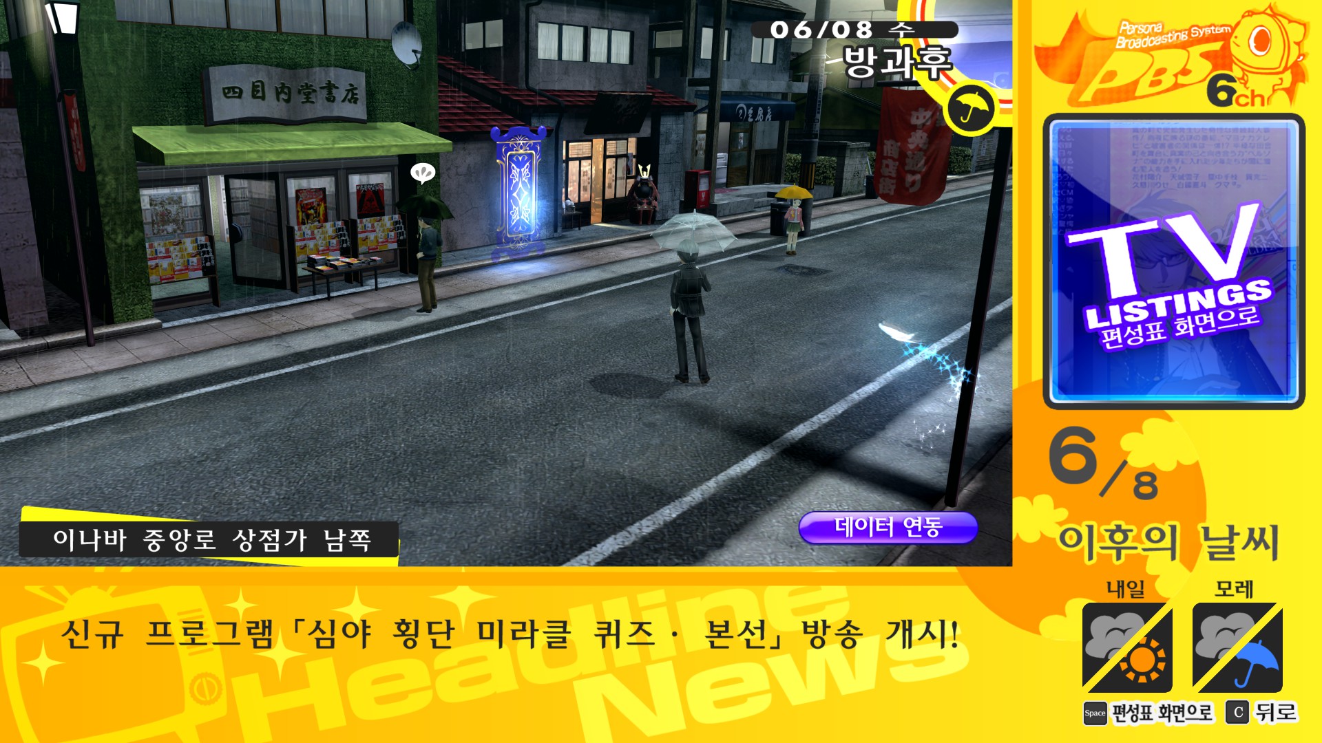 1회차 클리어 후에 도전과제 목록을 보다가, 심야 횡단 미라클 퀴즈가 있다는걸 알게 됐습니다. 그런데 퀴즈 답안은 있어도 어떻게 시작하는건지 안적혀있길래, 비올 때마다 TV를 애무해봤지만 퀴즈 개뿔 날씨예보만 나옴. 알고보니 메인 메뉴의 특전쪽에서 들어가거나, -pc판 기준으로 "/"키를 눌러서 즐길 수 있습니다.
