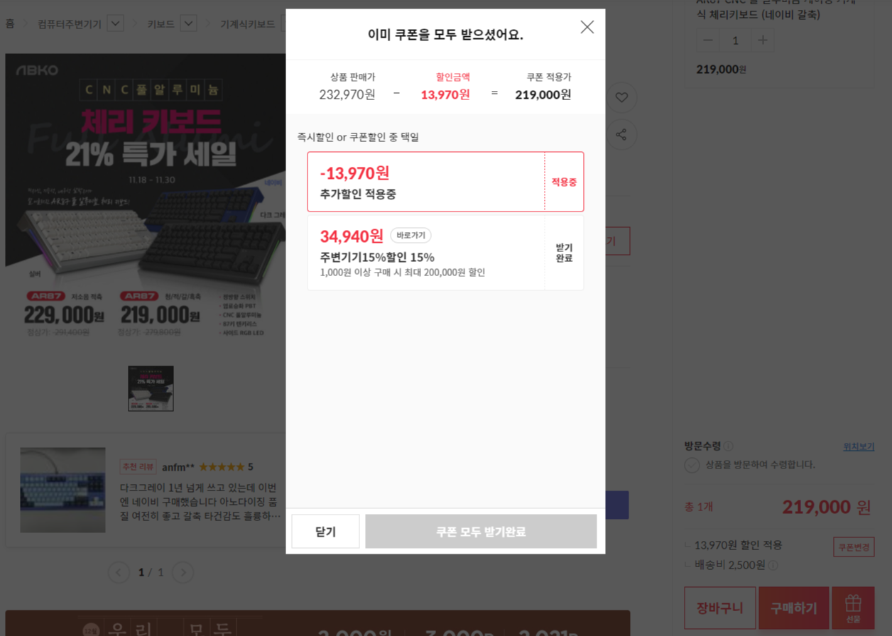 기본 할인 쿠폰 적용시 219000원, 34940원 할인 쿠폰도 있는데 이건 앱으로 들어가야 사용할 수 있을 것 같습니다. 아니면 11번가 메인에서 바로가기 적용? 이걸 켜면 활성화 될 것 같은데 안써봐서 모름.