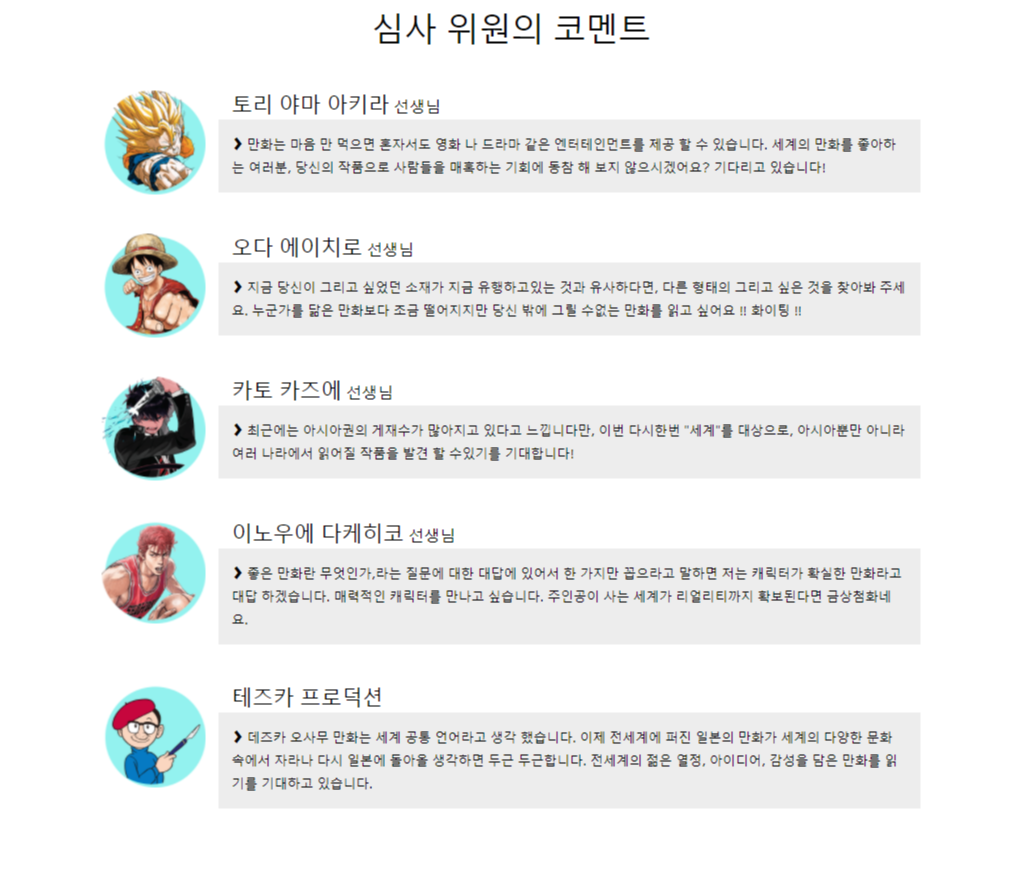 심사위원 조산명, 씹팔다 에이치로, 카토 카즈에, 인류역사상 최고의 아티스트, 데즈카 프로덕션, 히로아카 작가