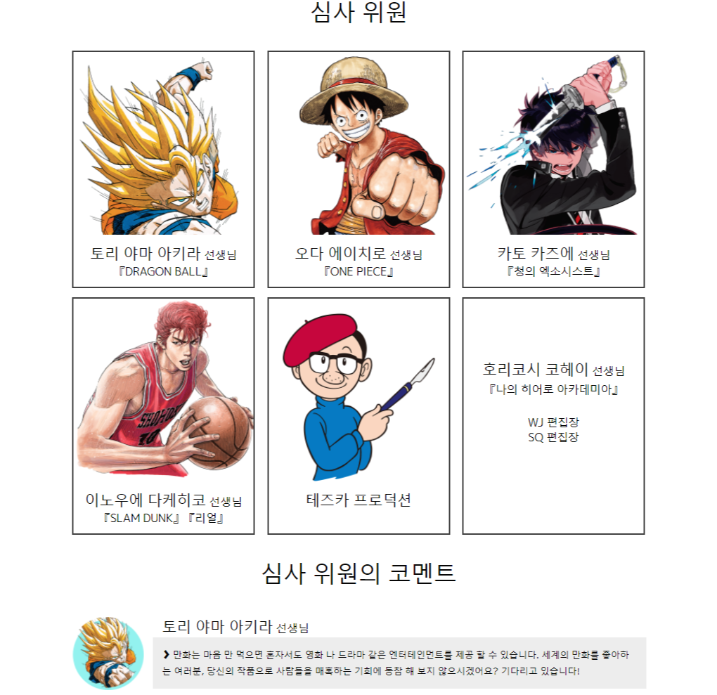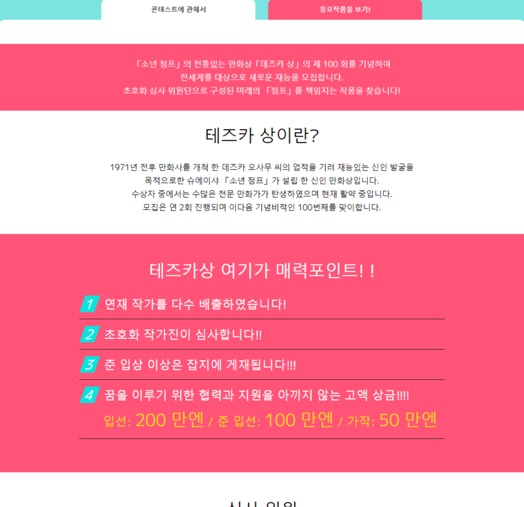 「소년 점프」의 전통있는 만화상「데즈카 상」의 제 100 회를 기념하여 전세계를 대상으로 새로운 재능을 모집합니다. 초호화 심사 위원단으로 구성된 미래의 「점프」를 책임지는 작품을 찾