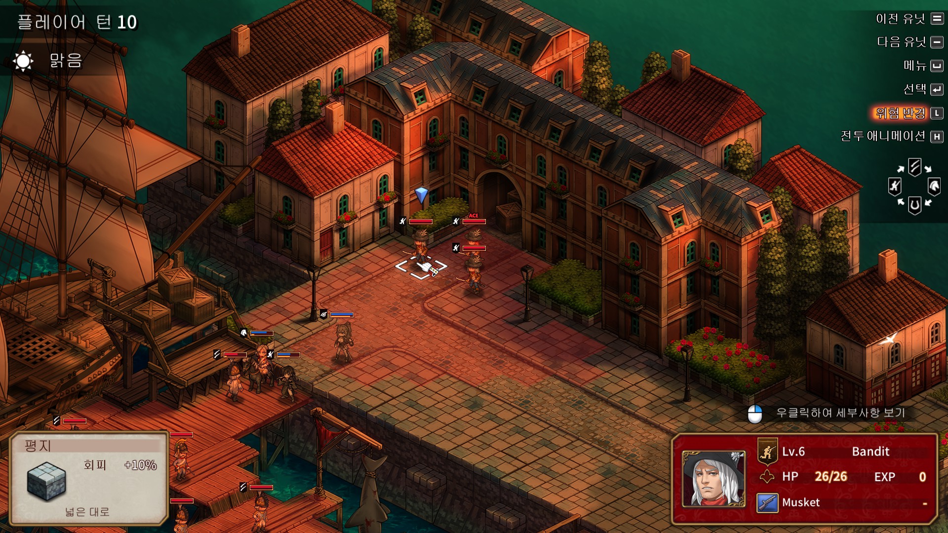 도적에게 맞을 때마다 무기 내구도(사용횟수)가 까이는거에 주의하시고, 필드 중앙쪽에 있는 상어에게 유닛을 배치해서 "조사"를 사용해주세요. "조사"는 특정 오브젝트에 가까이 가면 활성화됩니다. 조사는 나중에 발생하는 이벤트와 관련된 일이라서 앞으로는 전투를 시작하면 필드 구석구석을 마우스로 훑어본 후에 시작하는걸 권장합니다. 일반 지형은 평지, 수풀처럼 스테이터스 변화만 표기되거나 아무것도 표시가 안되는데 반해서, 조사가능한 오브젝트는 "조사 가능"이라고 표시됩니다.