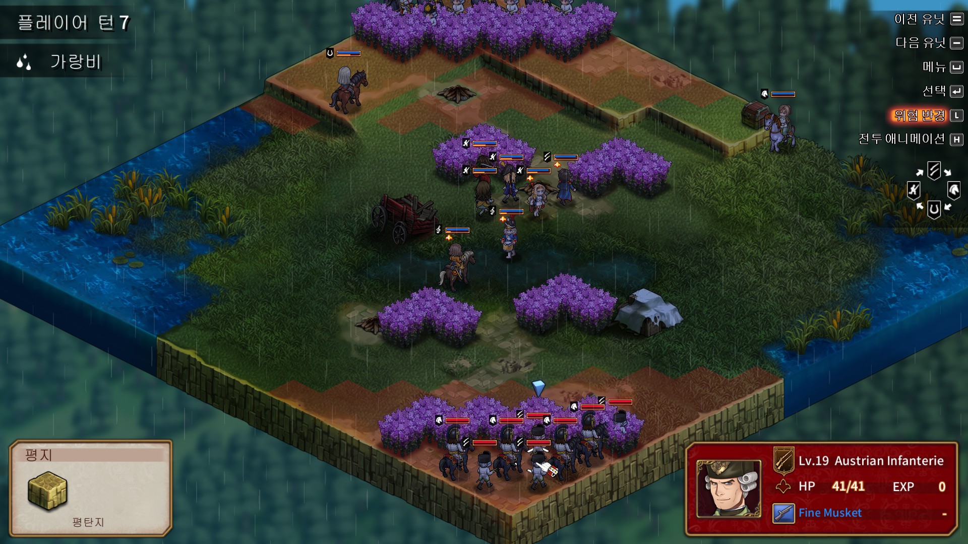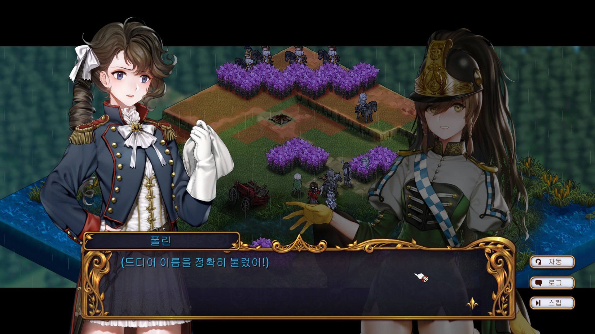 폴린과 란만 따로 떨어져 있습니다. 전방에는 포병과 경보병이 섞여있기때문에, 폴린과 란 둘중 한명의 레벨이 딸린다면 경보병에 주의해주시고, 둘다 레벨이 낮다면 최대한 소극적으로 자리를 잡으세요. 아예 움직이지 않아도 다가오는지는 잘모르겠습니다.