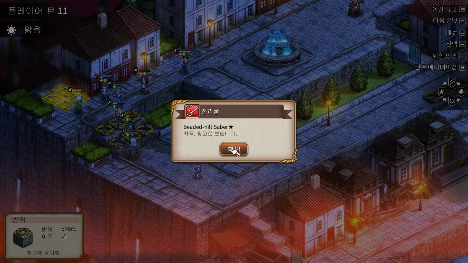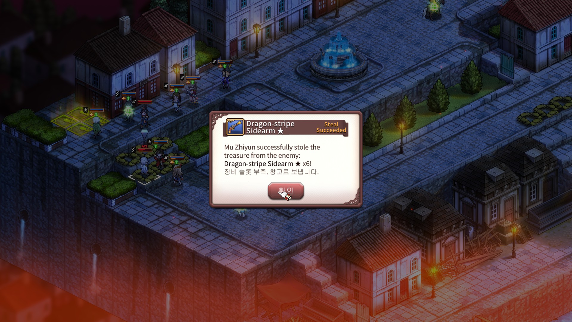 최후방의 적군(축대 뒤쪽에 있는 애들)은 가까이 둔감한 편이라서 아들레이드, 로르, 코제트 등을 미리 접근시켜놨다가 용맹공격(히로익 리로드 스킬 필수)을 이용해서 포병 위주로 쓸어버리세요.