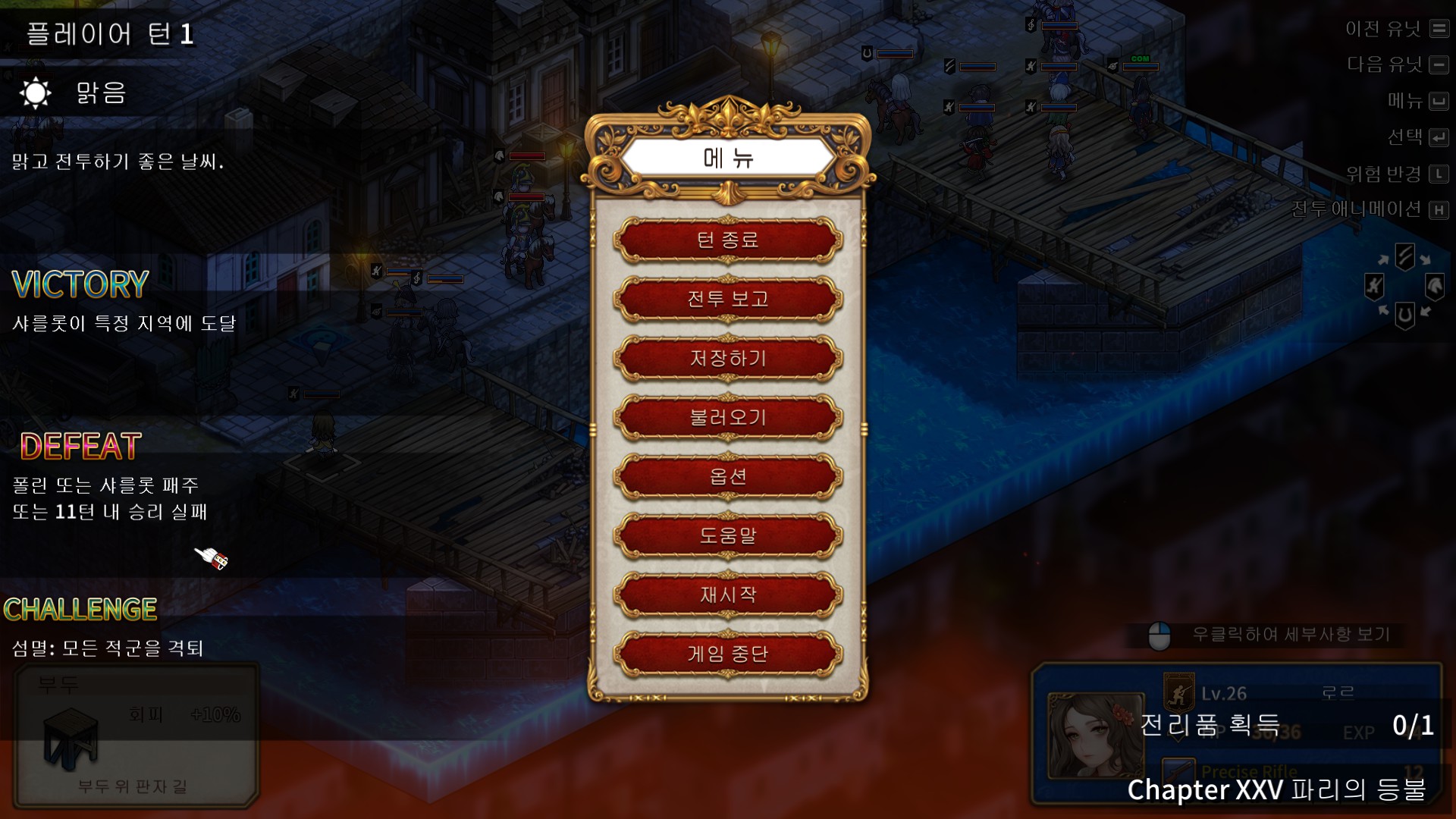 챌린지를 위해서라면 다 죽여야 되지만, 길바닥은 회피10% 업, 앙투아네트를 따로 키운게 아니고 1회차라면 중기병은 오스카 1명, 위로 올라가려면 민간인 집에서 트리거를 발동시킨 후에 문을 열어야 하기때문에 필연적으로 저 근처에서 발목이 잡히게 됩니다. 적경기병이 강력한건 아니지만 상술했듯이 턴제한때문에 최대한 빨리 잡는게 좋습니다. 웬만하면 이런 말을 안하겠는데, 3턴쯤에 미리 저장해놓고 최대한 빨리 잡을 때까지 연습(?)해보세요.
