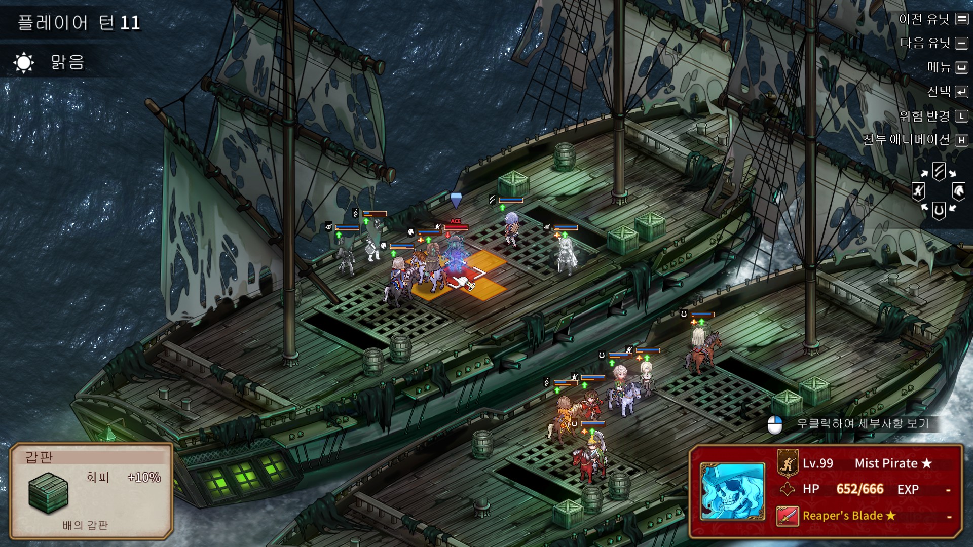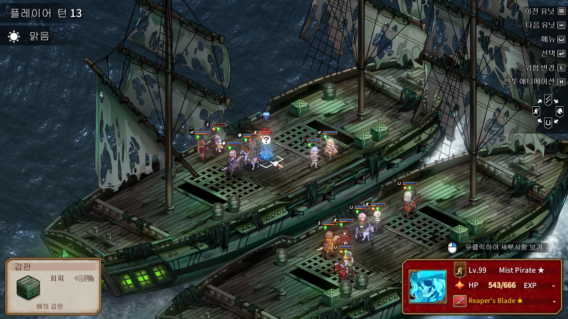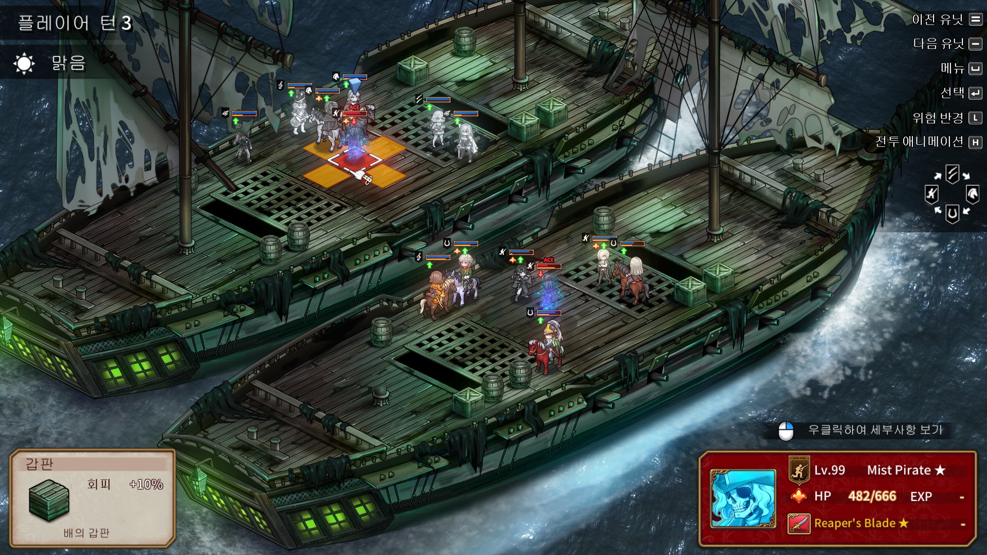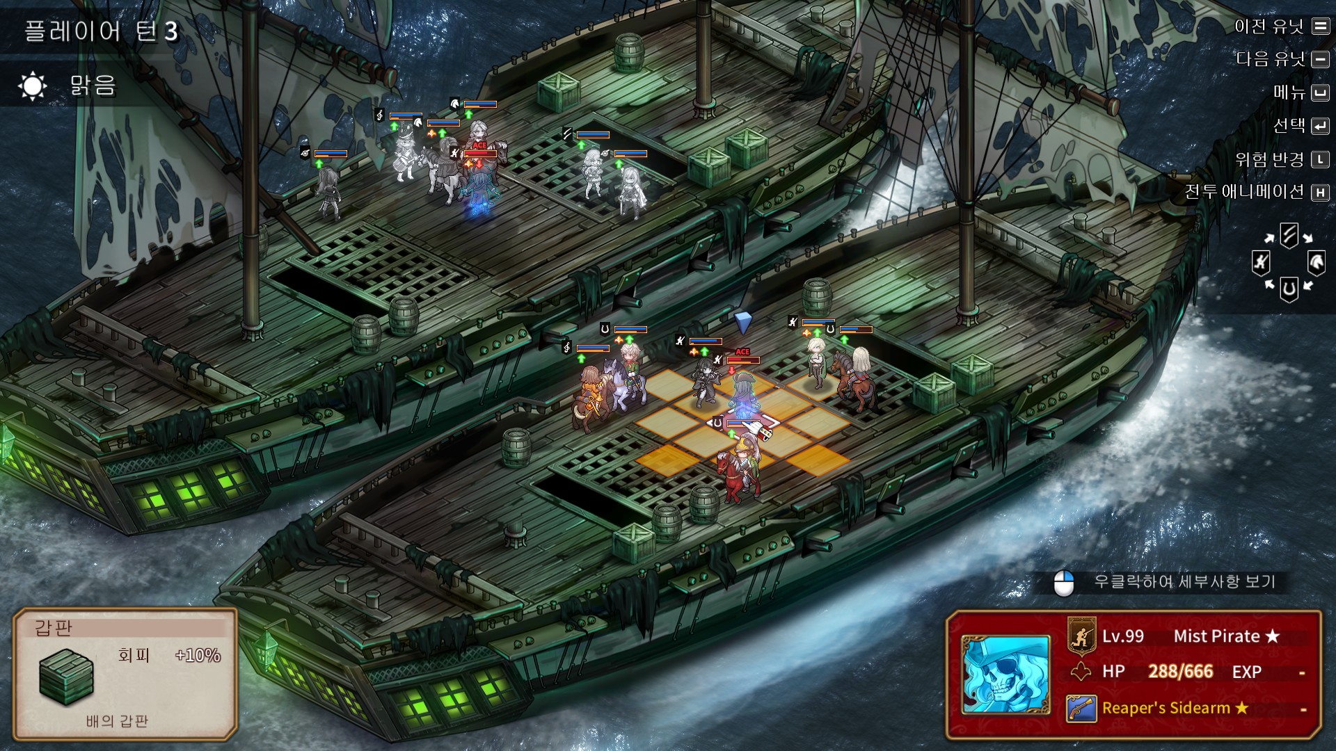 해적유령의 머리통에 느낌표가 뜨면 다음턴에 저 범위의 광역공격을 합니다. 피해는 25정도 들어왔던 것 같고, 피격시 이동불가 디버프에 걸립니다. 처음에는 범위를 표시해주지만, 광역공격을 한번씩 보여준 후에는 범위를 안보여주기때문에 패턴을 숙지하셔야 됩니다.