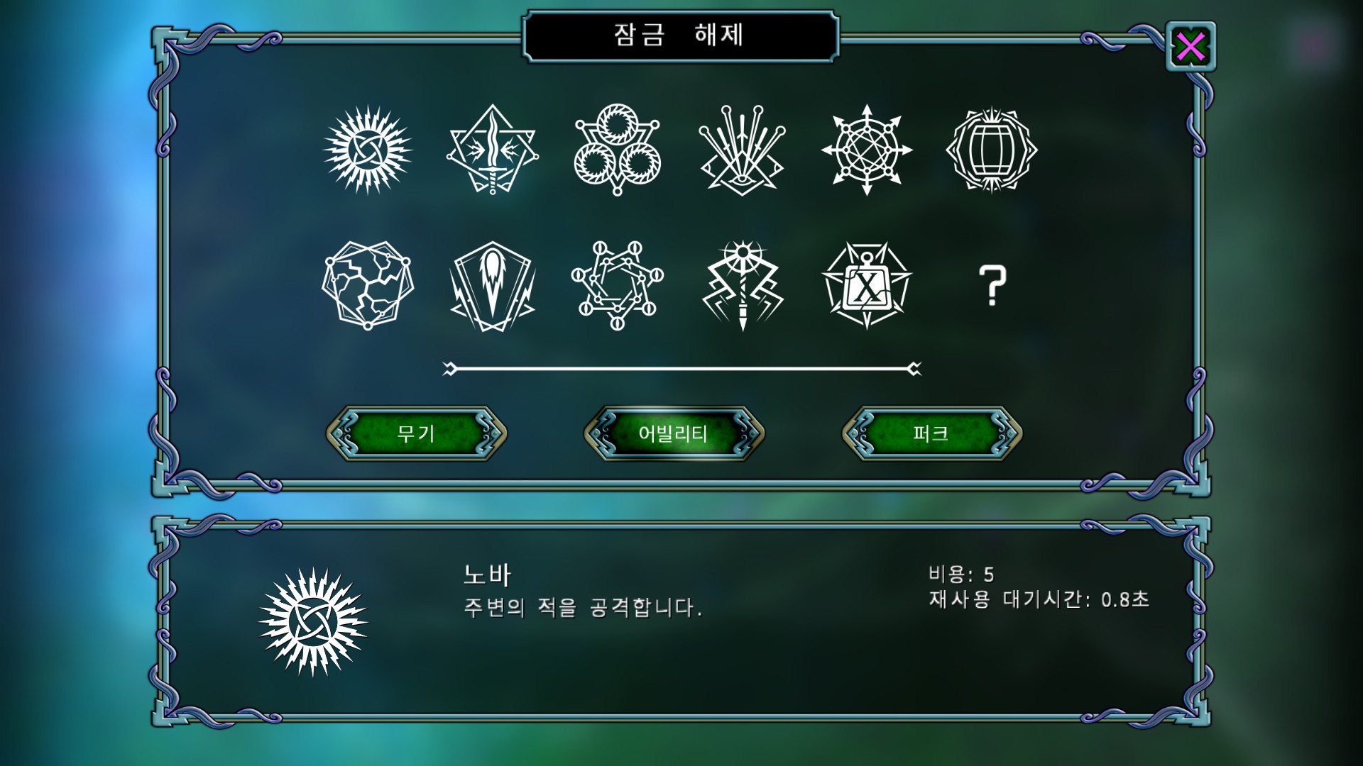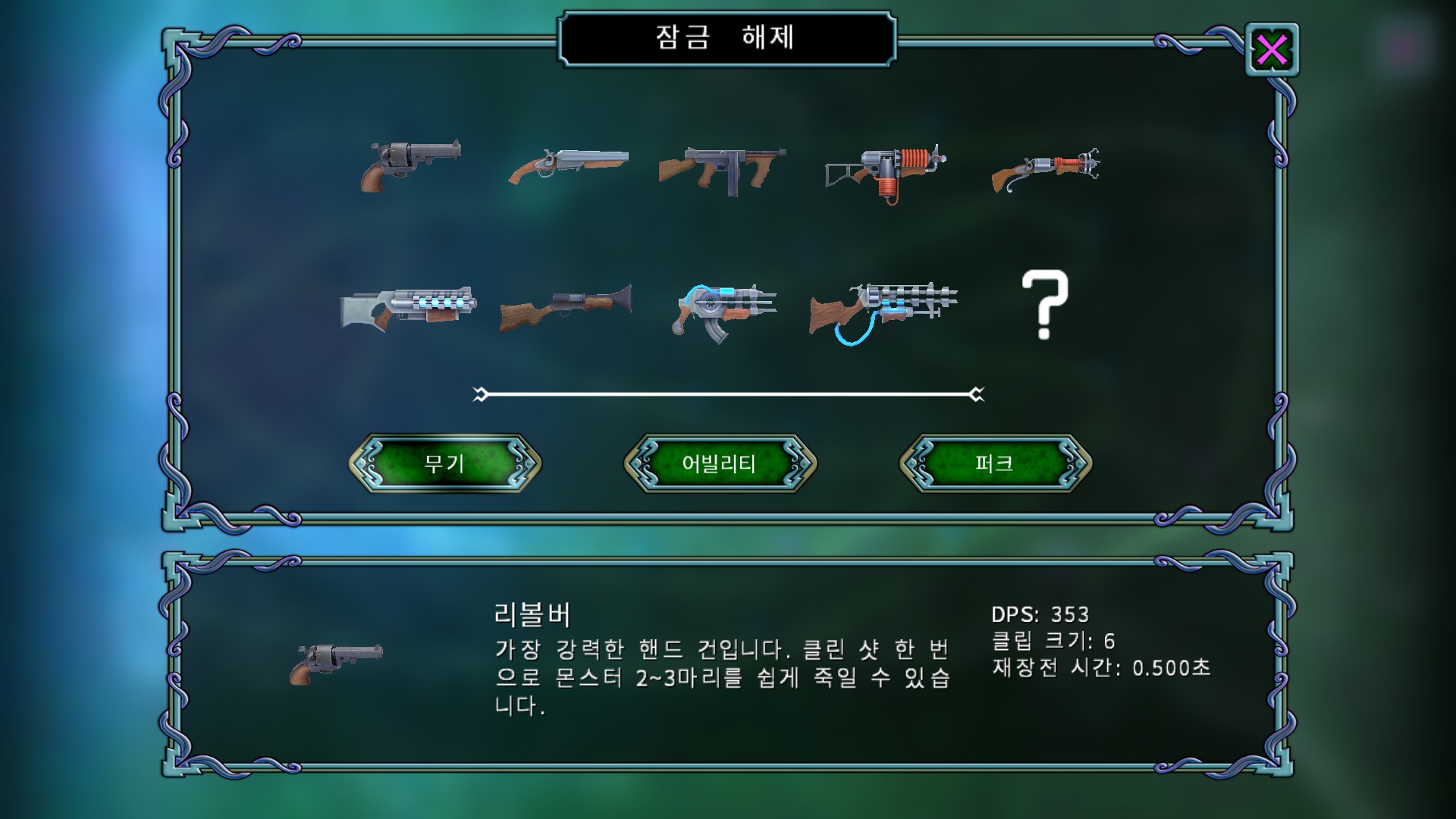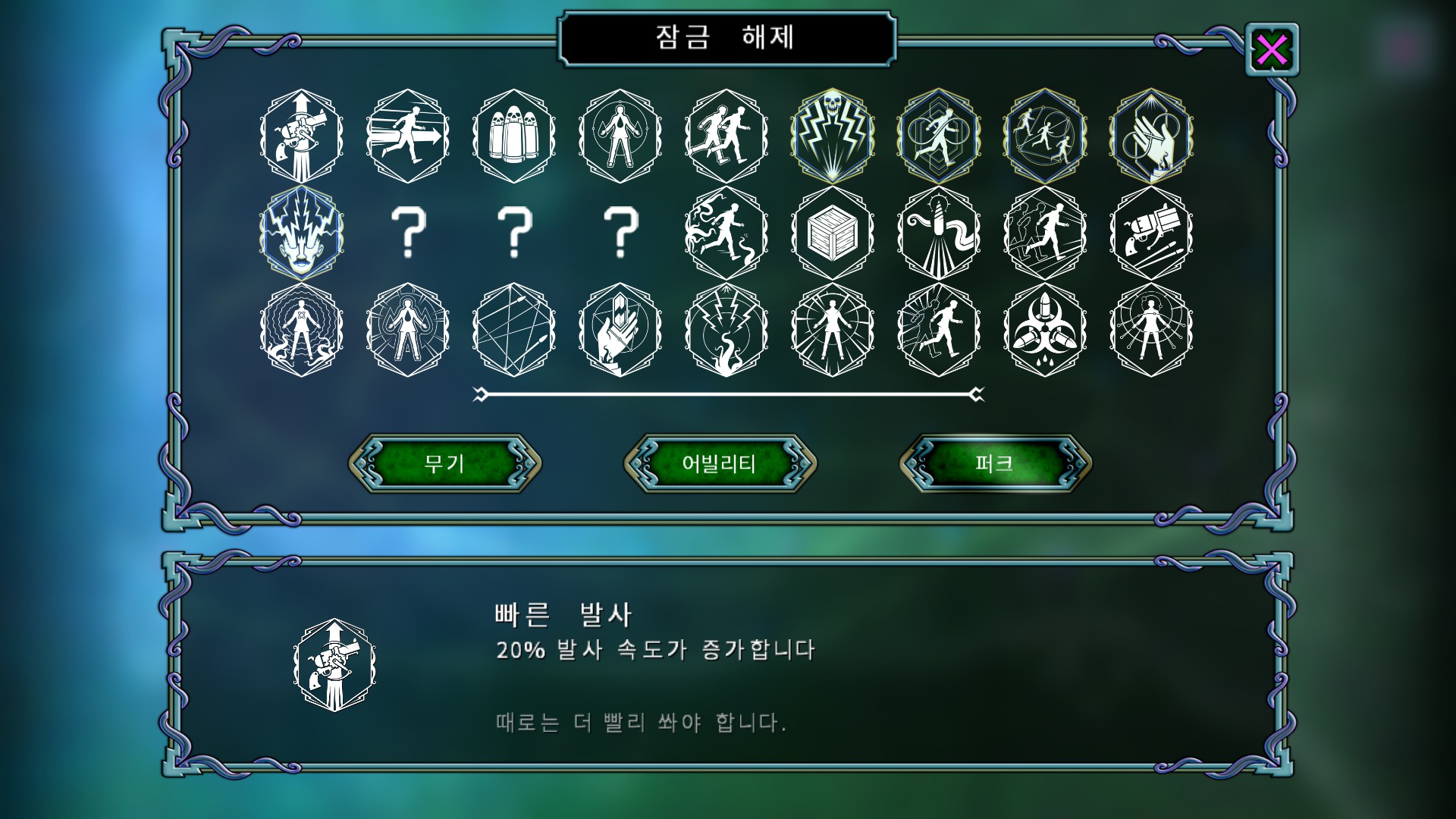 무기의 경우 플레이 하다보면 하나둘씩 필드에 드랍되는걸 루팅해서 해금하는 방식입니다. 마지막 물음표는 뭔지 모르겠네요.