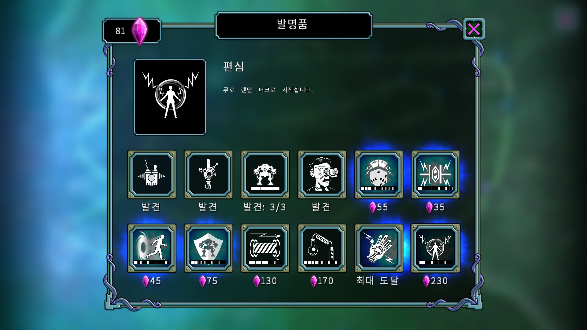 이게 이 게임의 퍽 전부입니다. 테슬라가 이상한걸 뒤집어쓴 아이콘 오른쪽 퍽은 비교적 빨리 찍을 수 있는데, 여러가지 퍽을 섞어서 새로운 퍽을 만들어주게 해준다고 적혀있습니다. '이걸 찍으면 퍽이 랜덤으로 합성되겠구나' 라는 생각으로 찍어봤지만, 그냥 리롤(re-roll) 횟수를 늘려주는 퍽이었습니다. 효율 자체는 괜찮은편이지만, 에픽퍽하고 조합하는게 아니라면 살짝 희망고문 느낌. 개인적으론 테슬라머신의 내구도를 올려주는 퍽이 효율이 좋고, 순간이동 횟수를 늘려주는 퍽도 괜찮습니다. 순간이동 했을때 데미지 20 주는 퍽은 안찍는게 나은 수준.