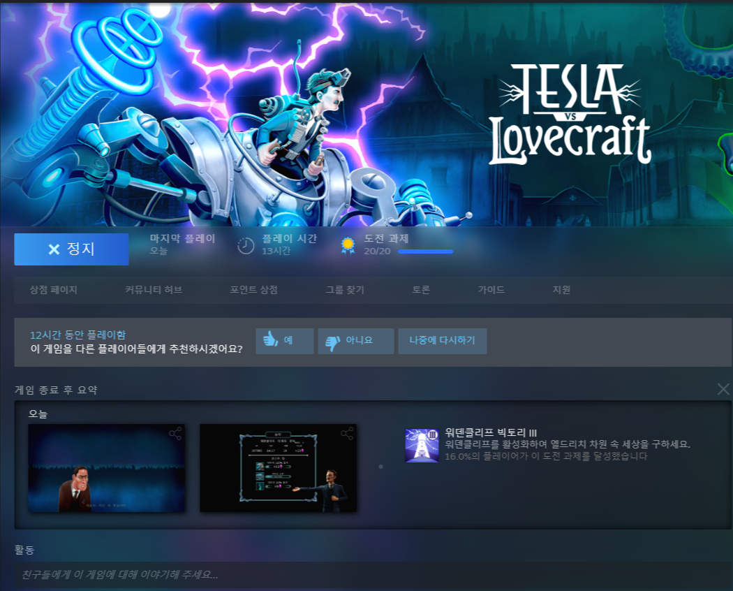 몇년전에 찜목록에 박아놨었는데 단일로 사기에는 뭔가 돈아까울 것 같은 예감이 팍팍 들어서 번들로 구매한 그 게임, 테슬라 대 러브크래프트. 게임 이름부터 삐끕 냄새가 납니다. 장르는 탑다운 슈터로 키보드로 테슬라(...)를 조종해서 촉수괴물들을 시원하게 다 쏴죽이는게 끝. 아무 생각없이 다죽이는 게임이라서 머리가 복잡할때 즐길만 합니다.