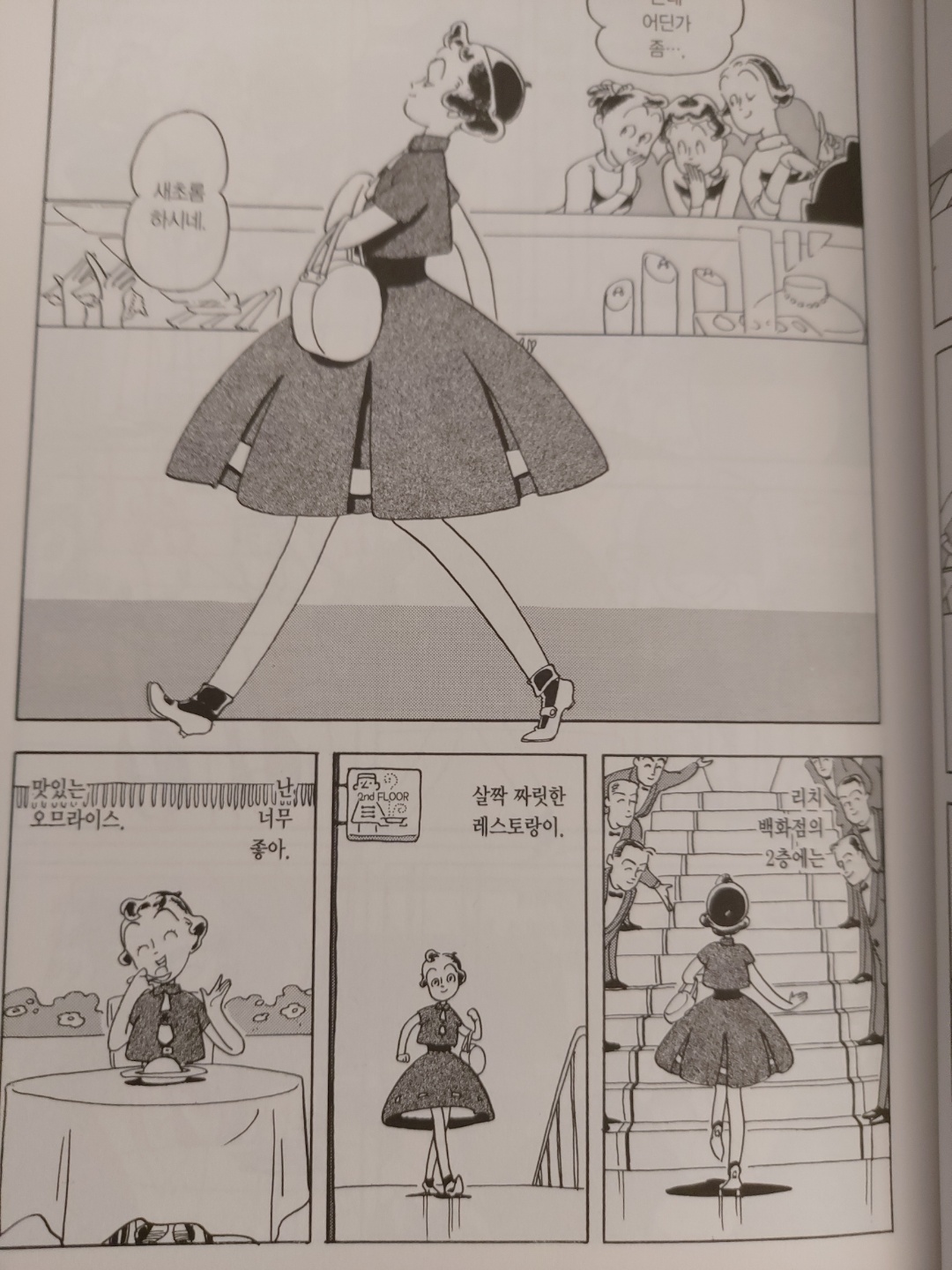 이야기의 중심은 당연히 인물이지만, 일반적인 만화처럼 인물이 뱉는 대사에만 집중하는 것이 아니라, 시야를 이곳 저곳으로 돌리면서 대사와 나레이션을 쏟아내다보니 독특한 리듬감을 느낄 수 있다.