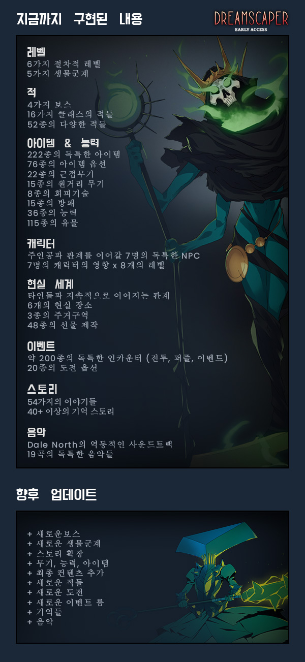 드림스케이퍼는 격투 게임과 탑다운 슈팅, 던전 탐험의 요소를 결합한 로그라이트 게임입니다. 잠이 들 때마다 던전은 새로워지며, 다양하고 독특한 이벤트와 도전들로 세계는 변화합니다. 주인공 캐시디는 운명을 탈출하기 위해 잠재의식으로 뛰어들어 초현실적인 악몽과 싸워나갑니다.