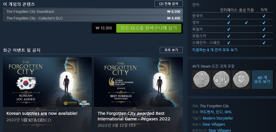 The Forgotten City는 세 명으로 구성된 팀이 4년에 걸쳐 개발한 게임입니다. 여러분의 후원이 없다면 저희는 이 일을 계속할 수 없을 겁니다. 감사합니다.