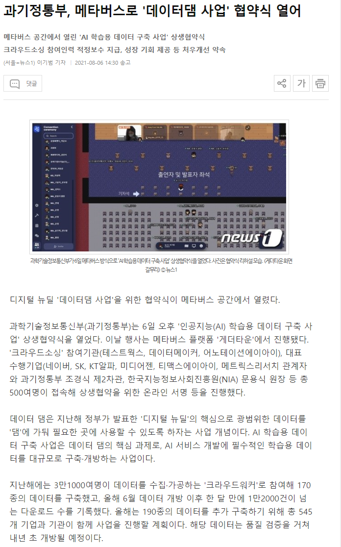 과기정통부, 메타버스로 '데이터댐 사업' 협약식 열어 (news1.kr)