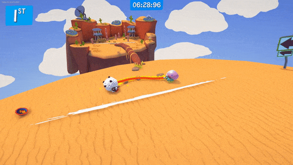 Fling to the Finish is a cooperative racing game where teammates are tethered together by a stretchy elastic rope. Get up close and personal with your partner to maneuver two characters bouncing, rolling, and flinging their way to the finish line!