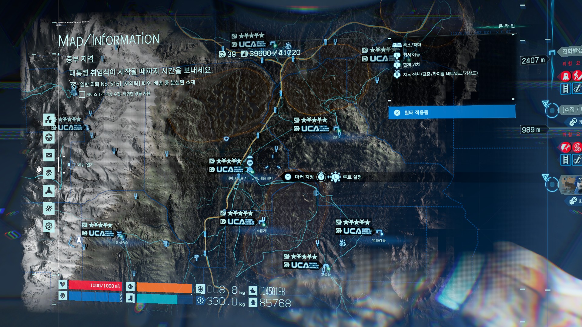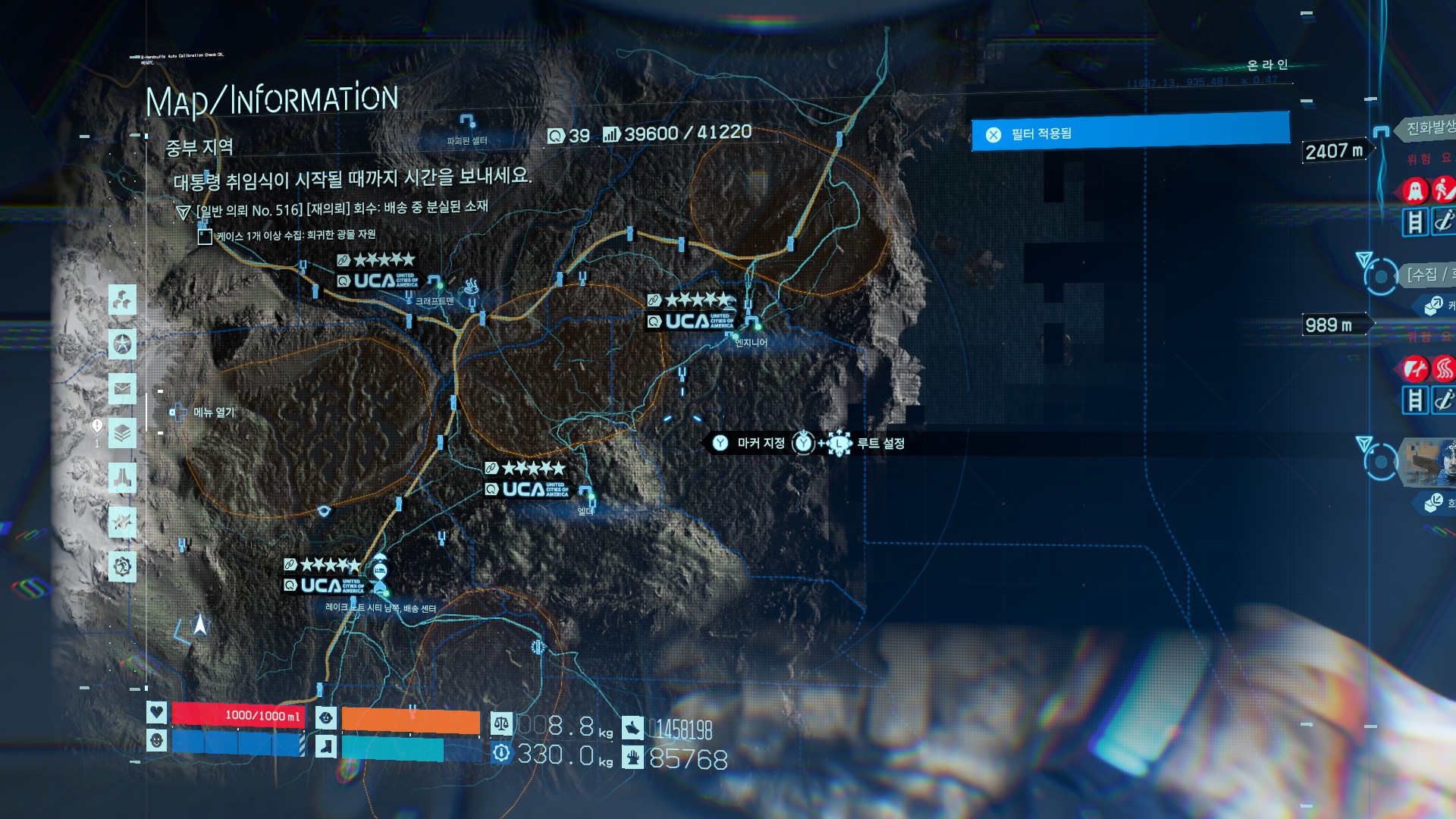 영화감독를 방문하는 경로는, 남쪽배송센터에서 다리를 건넌 후에(웬만하면 건설되어 있을 확률이 높음), 엘더지역 산기슭라인을 따라서 빠르게 이동하면 뮬을 피해갈 수 있습니다. 중간쯤에 뮬 스캐너에 걸리긴 하지만 오토바이, 트럭으로 길만 따라가면 여유있게 회피 가능. 탈것의 레벨이 낮고, 완충상태가 아니라면 중간에 방전될 수 있으니까 적당한 곳에 배터리를 설치하면 좋습니다.