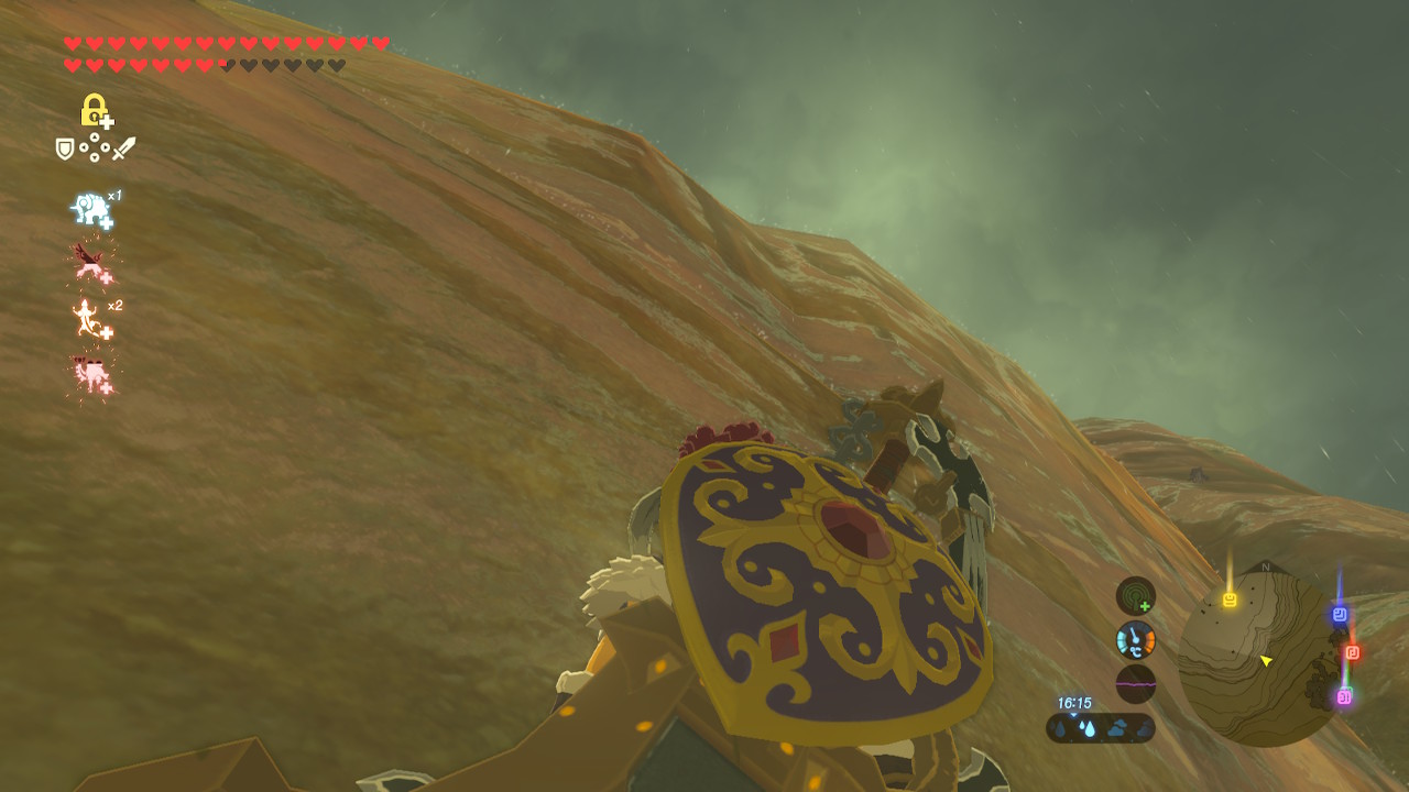 허나 하이랄의 자연이란게 굉장히 불합리하게 느껴지는 경우도 분명히 존재한다. 예를 들어, 등반을 해야 하는 상황 혹은 등반을 하는 상황에서 갑자기 비가 오는 경우를 들 수 있을 것이다. 리발의 토네이도를 사용할 수 있다면 괜찮지만, 그렇지 못한 상황이라면?