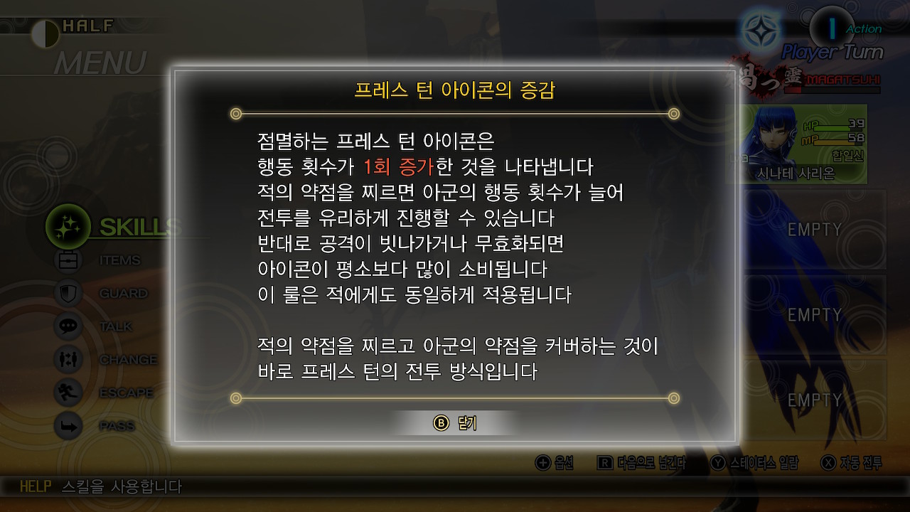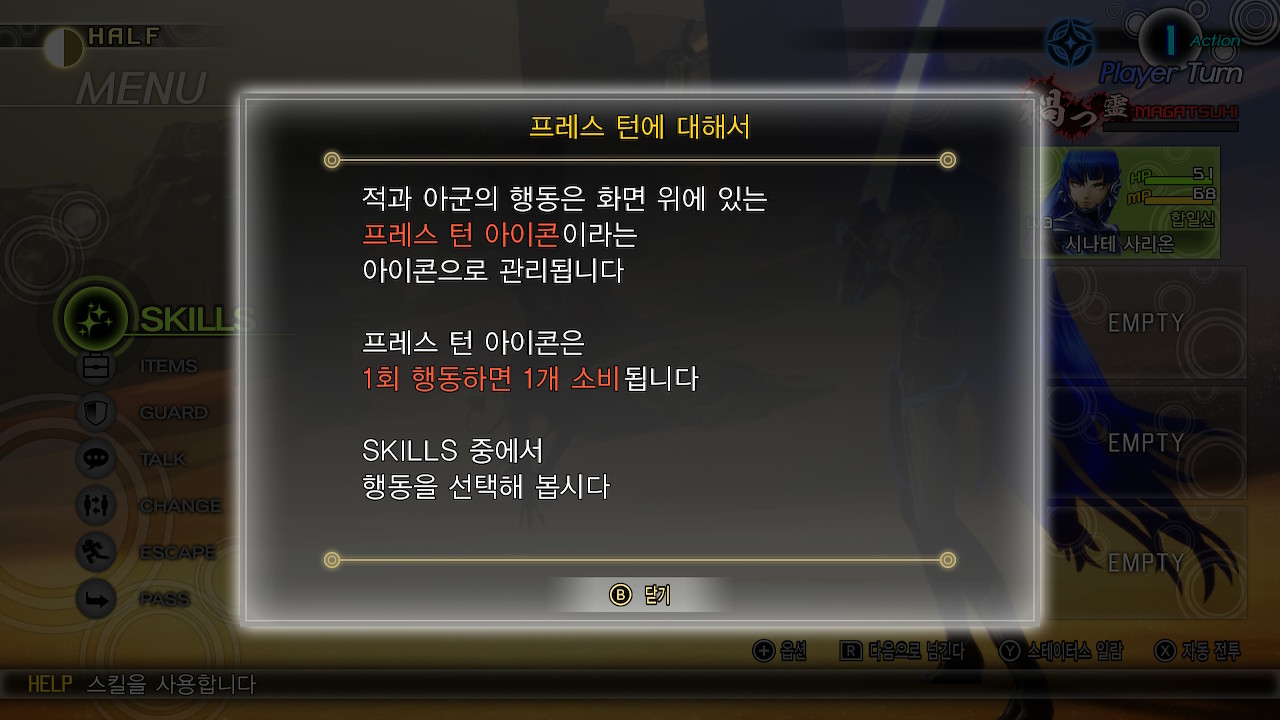 패스를 선택하면 UI상 점등한 파티원 다음에 위치한 파티원으로 턴을 이양할 수 있습니다.