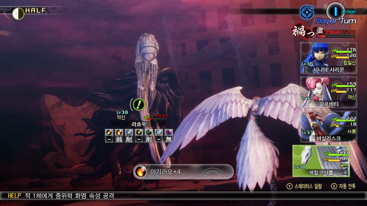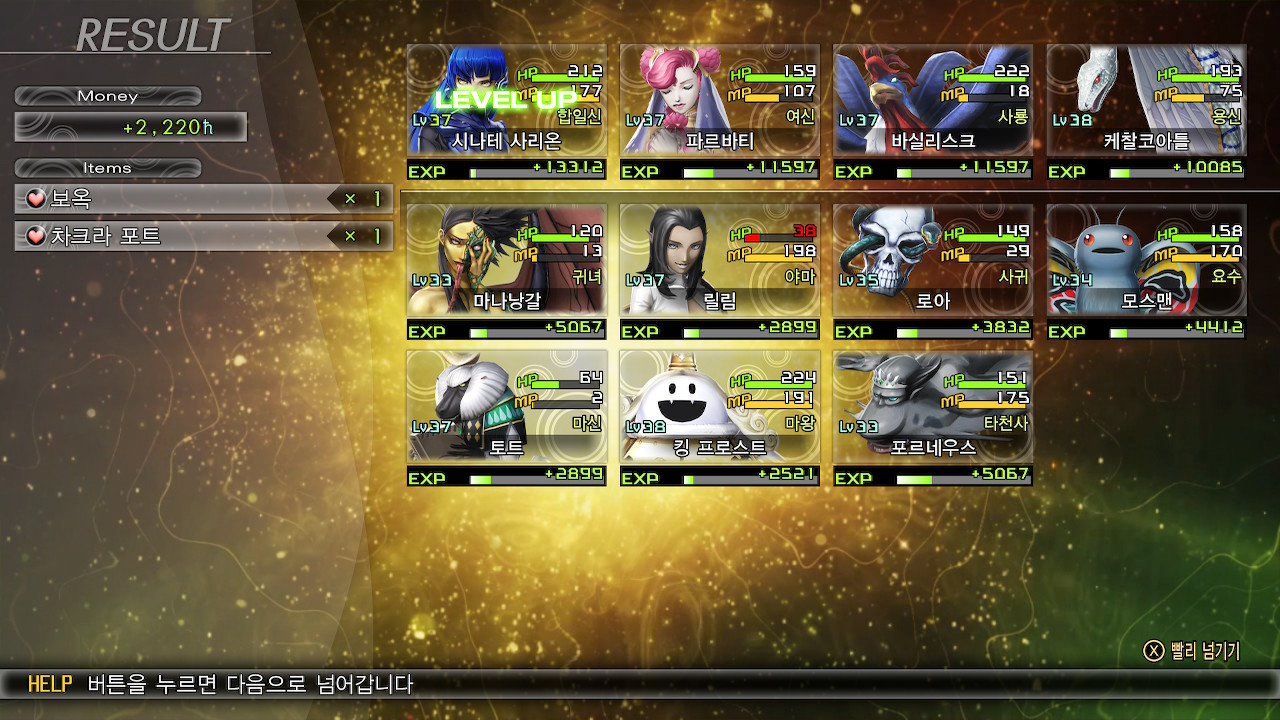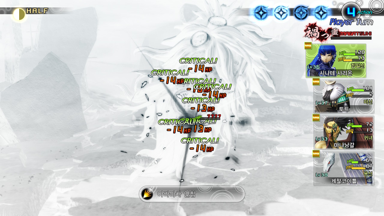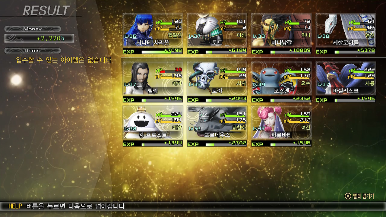 만약에 자연난타에 파티가 터진다면 레벨이 낮거나 체력에 문제가 있다는거니까, 마도서로 악마들 레벨을 좀 올리거나 향을 넣어서라도 능력치를 뻥튀기 하고 난후에 재도전 합시다. 악마상을 아껴놨다면 라흐무를 잡기 전에 모아놨던 악마상들을 싸그리 먹고 오세요.