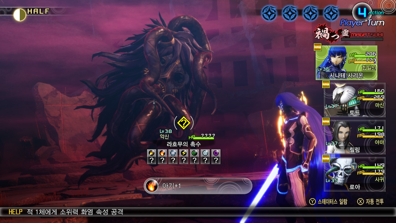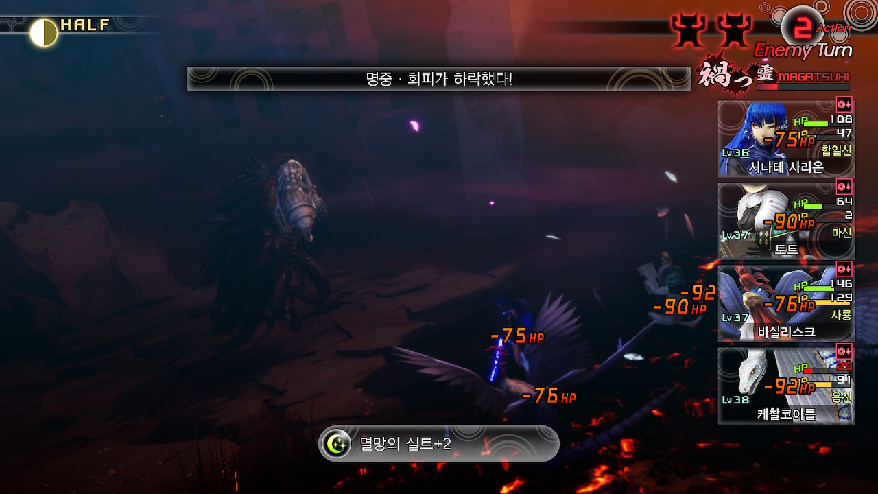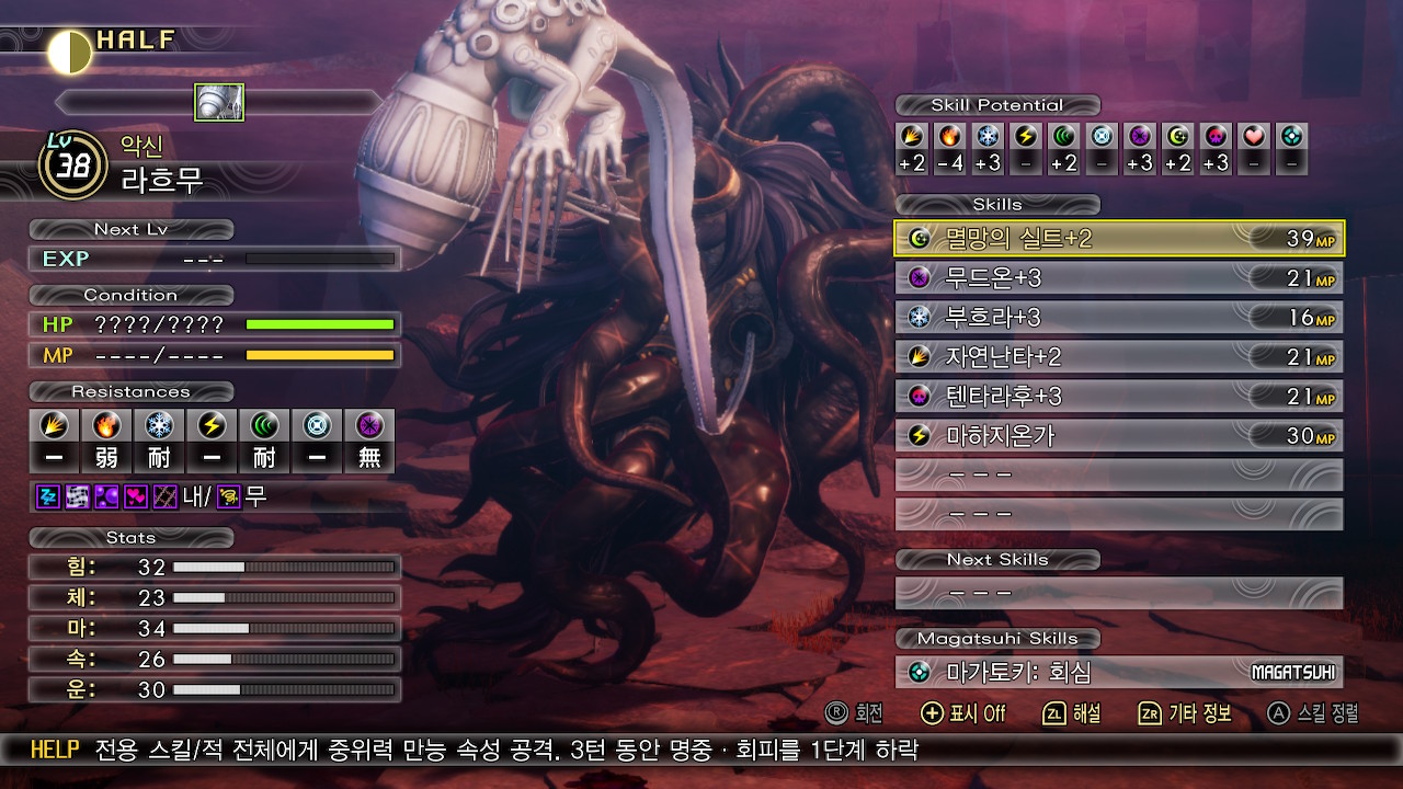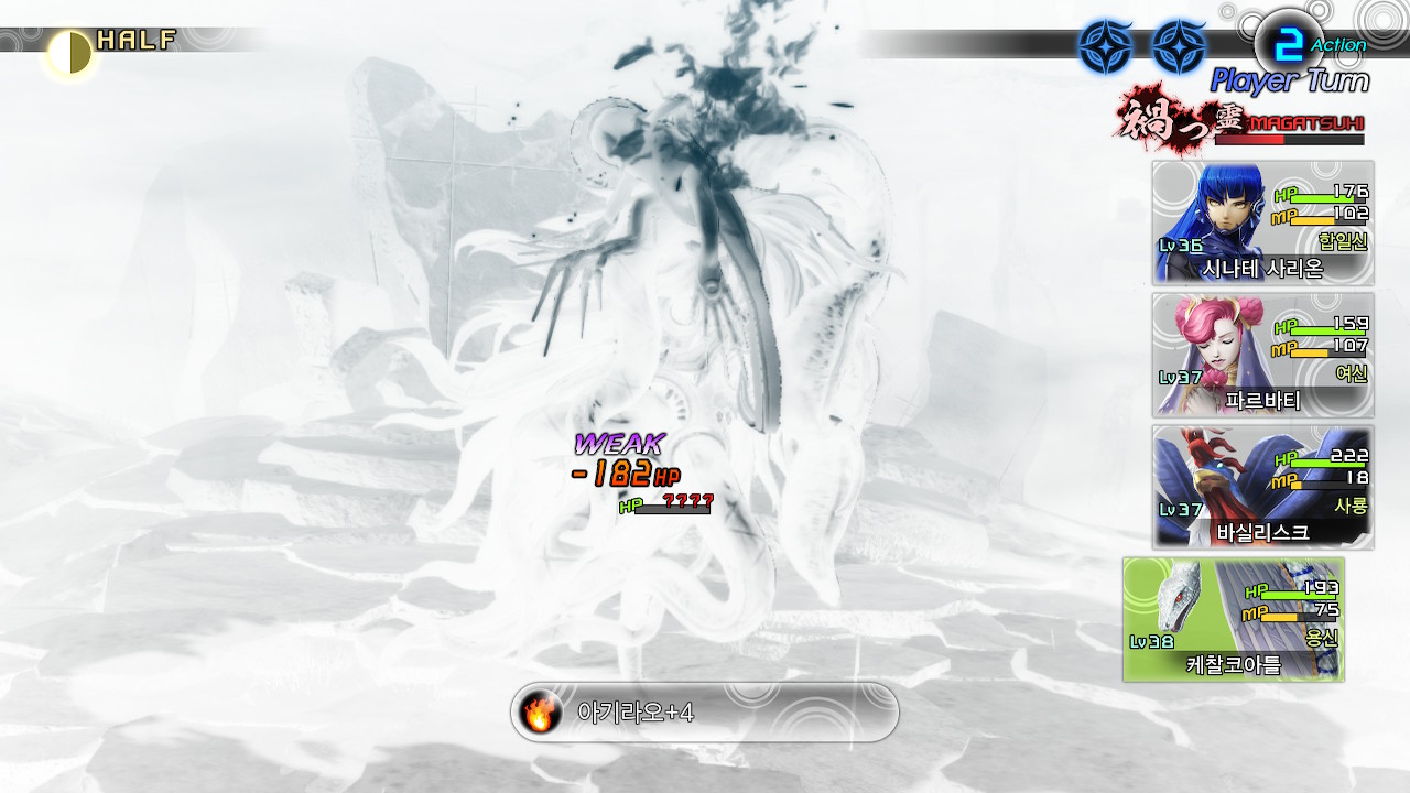 만약에 자연난타에 파티가 터진다면 레벨이 낮거나 체력에 문제가 있다는거니까, 마도서로 악마들 레벨을 좀 올리거나 향을 넣어서라도 능력치를 뻥튀기 하고 난후에 재도전 합시다. 악마상을 아껴놨다면 라흐무를 잡기 전에 모아놨던 악마상들을 싸그리 먹고 오세요.